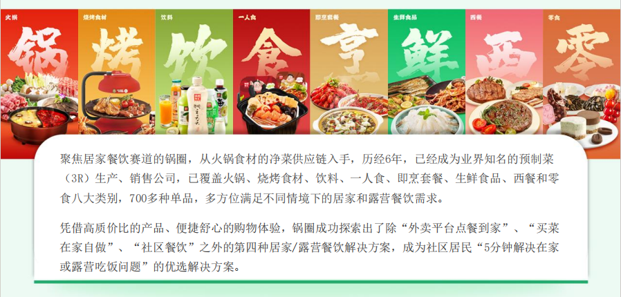 锅圈食汇,是锅圈食品(上海)股份有限公司旗下的明星品牌,成立于2017年,是一站式在家吃饭餐食品牌,历经6年发展,锅圈已升级为社区餐饮数字零售化知名企业,目前全国门店和线上业务已覆盖火锅、烧烤食材、饮料、一人食、即烹套餐、生鲜食品、西餐和零食八大类别,满足社区居民多种家庭和露营餐饮需求。