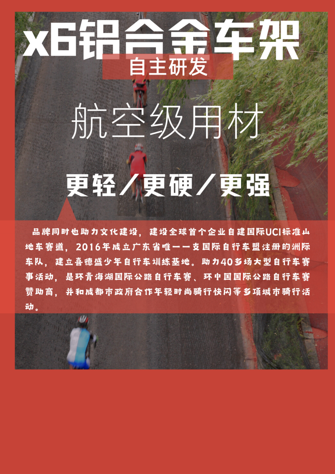 深圳喜德盛自行车股份有限公司于1995年成立于深圳光明,深耕于自行车行业多年,覆盖从上游碳纤维、铝合金、镁合金新材料的研发到自动化制造、销售渠道的全产业链布局。获得过“国家级高新技术企业”、“中国轻工业百强企业”“中国自行车运动协会战略合作伙伴”等品牌荣誉,与中国国家山地自行车队正式签约,成为中国国家山地自行车队奥运会指定竞赛用车。