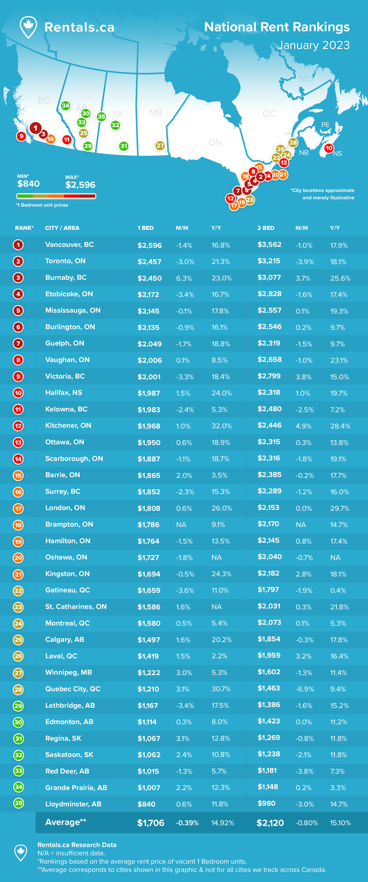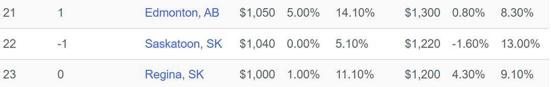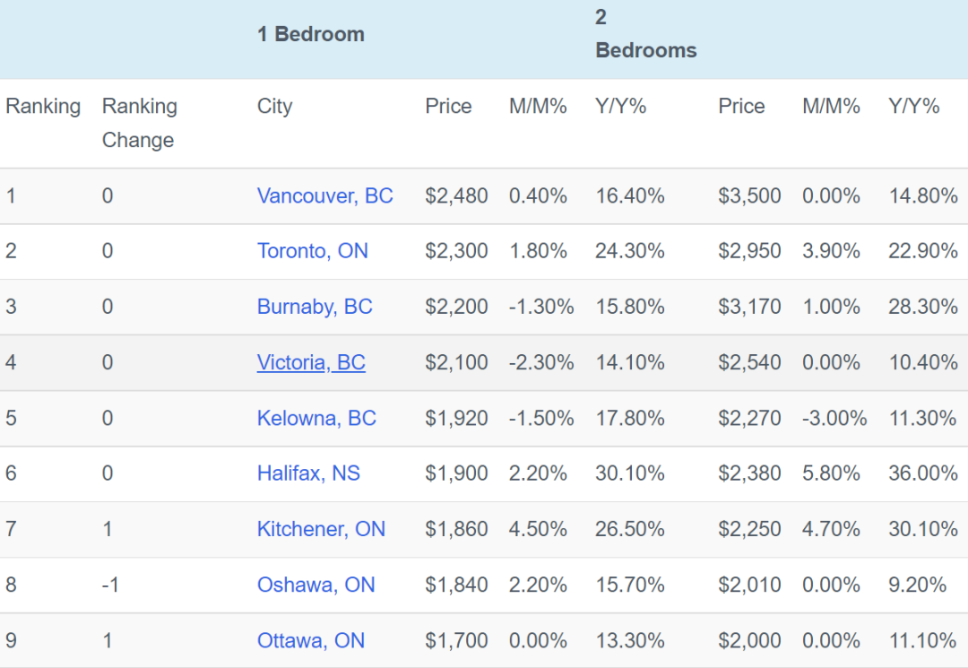 多伦多市排名第二,一居室租金较上月小幅上涨1.8%至$2300元,而两居室租金上涨3.9%至$2950元。较去年同一时期相比,一居室租涨幅为24.3%,两居室涨幅为22.90%。纵观近两年的租金变化,虽然多伦多的房价曾一度接近温哥华,但租金方面一直存在一定差距。