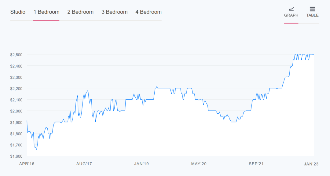 报告还显示,在各种类型的房产里,一居室平均租金年涨幅为9.1%,达到了$1714元,两居室单元的平均租金年涨幅最为强劲,达到了10.6%,即$2095元。租金涨幅最慢的是三居室单元,年涨幅为6.2%,即$2346元。
