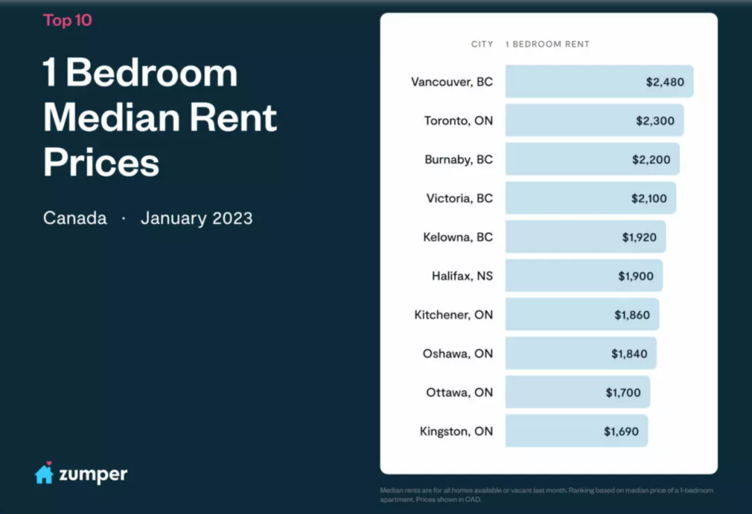 租房网站Zumper日前发布了1月份加拿大住宅租金报告,数据来源于该网站数十万个房源,并对加拿大24个人口较多城市的租金中位数进行了排行。该报告基于发布前一个月所有的可用数据。