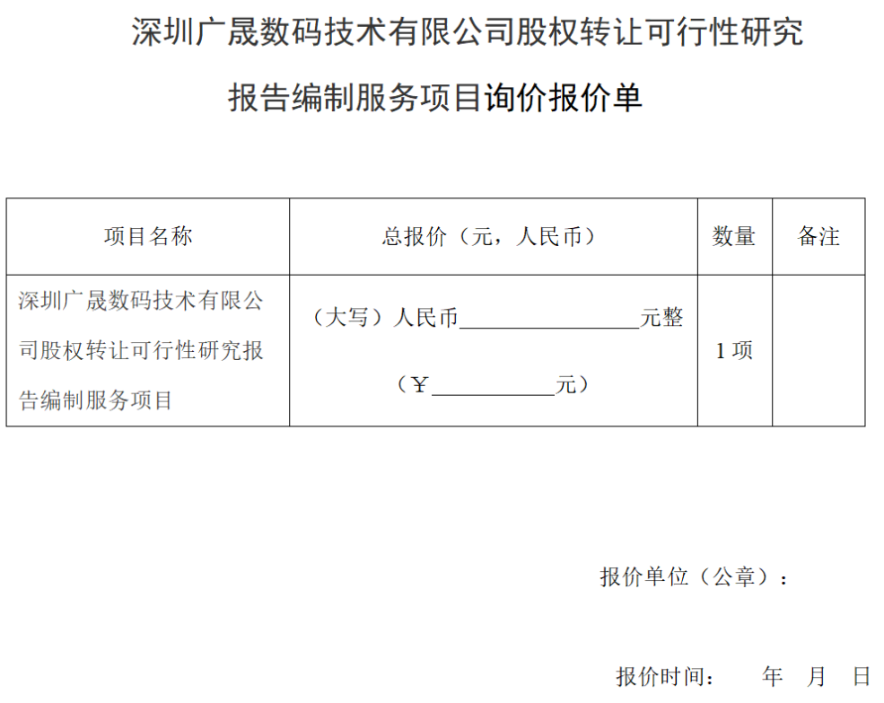 我司拟对深圳广晟数码技术有限公司(下称:深圳数码)60%股权转让可行性研究报告编制项目进行采购,按照相关要求,现邀请各供应商对本项目费用进行报价,我司将结合此次报价作为后续招标遴选服务商的参考依据,待平台相关信息公布后,欢迎各机构单位准时参与平台报名。现诚邀各机构单位按以下要求提交询价报价单。相关事项说明如下: