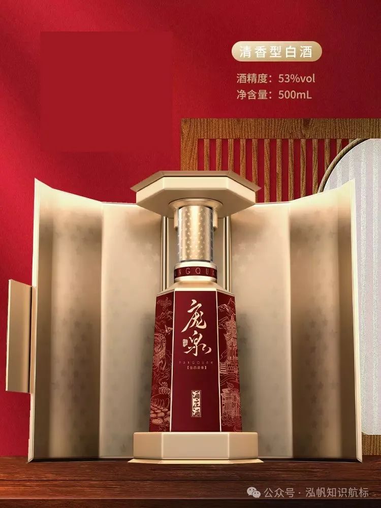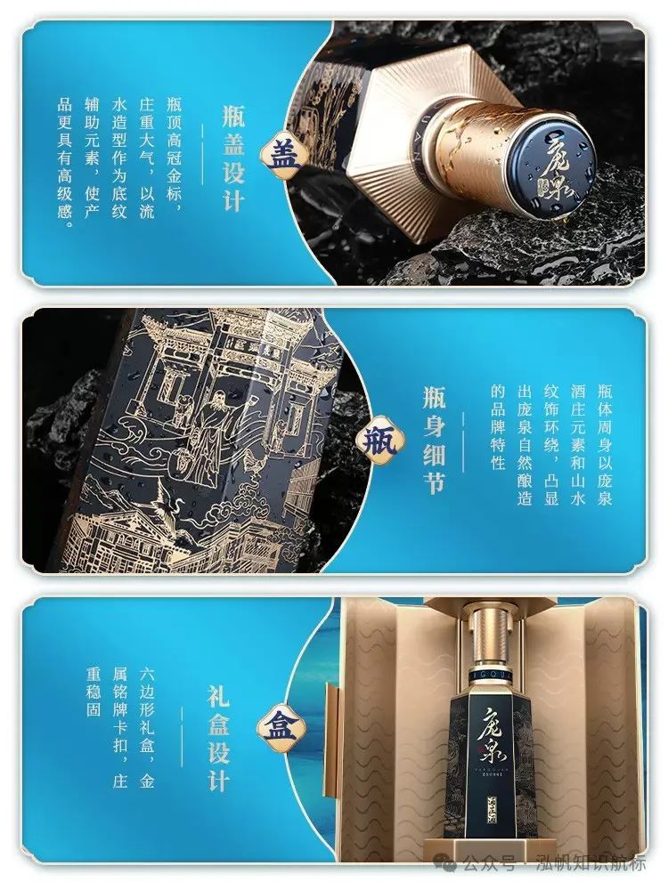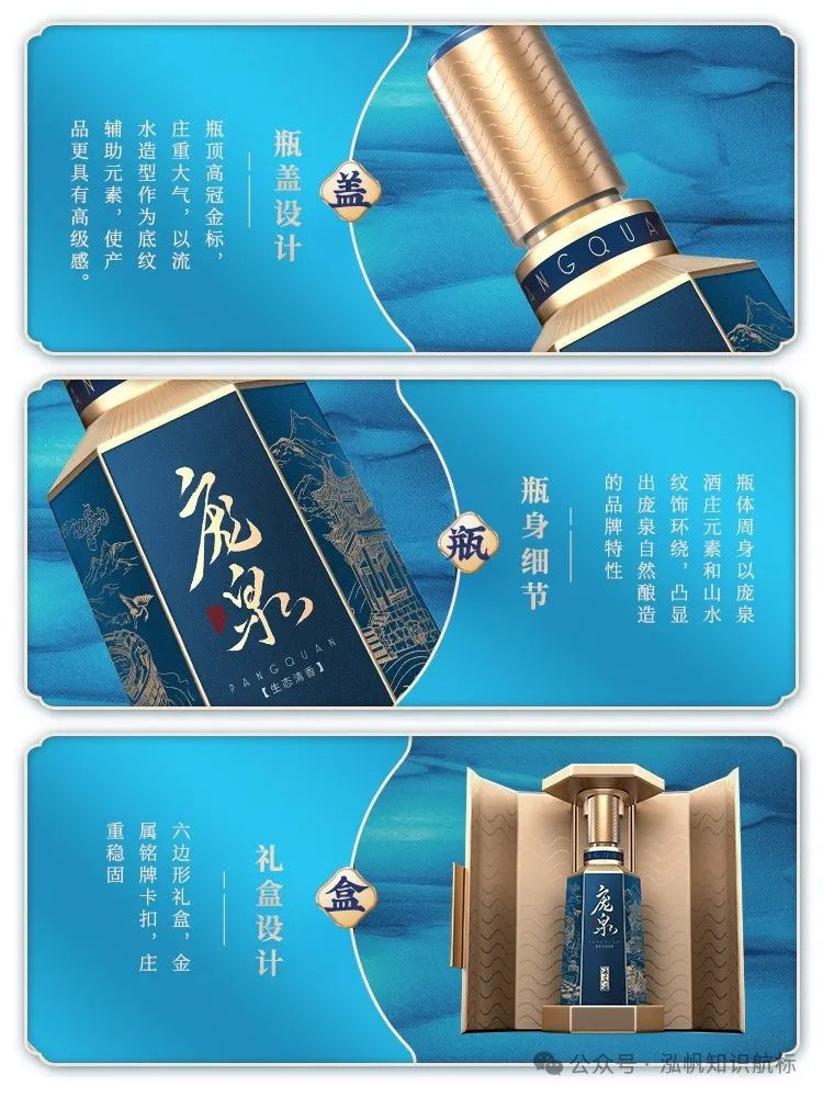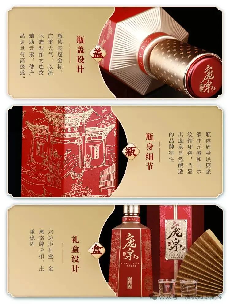 六边梯形的造型设计,表达“庞泉水”源于“庞泉井”,其金顶造型也彰显了做为酒庄酒的产品特点,庄重大气,使其物理属性升华到产品表现的文化属性。瓶盖以流水造型为底纹辅助元素,使产品更具有高级感。瓶体周身以庞泉酒庄和山水纹饰环绕,凸显更加真实的生态酿造,让消费者对庞泉生态酿酒的印象更为深刻。
