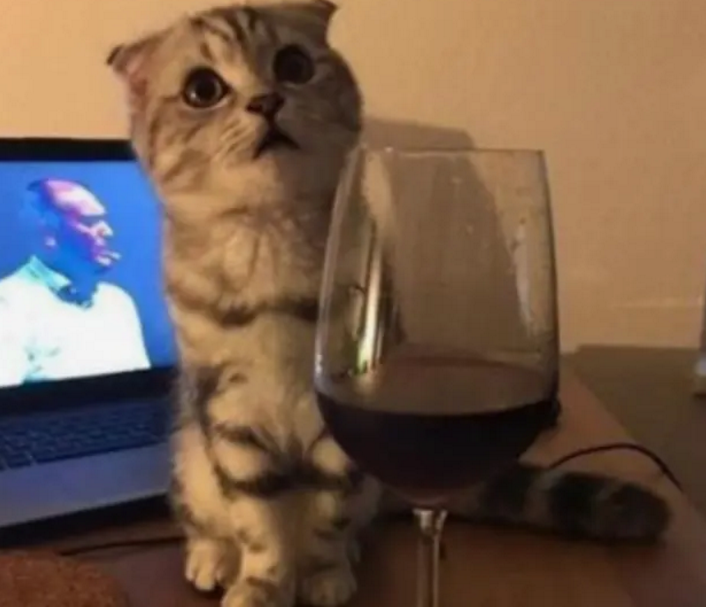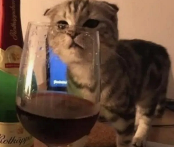 结果刚打开红酒,原本不知道藏在哪里睡觉的猫咪,就突然跳到了桌子上,然后就毫不客气地走到了红酒边,好像是主人专门给它开的一样,一点都不害羞啊。于是猫咪就直接把头伸进了酒杯里。