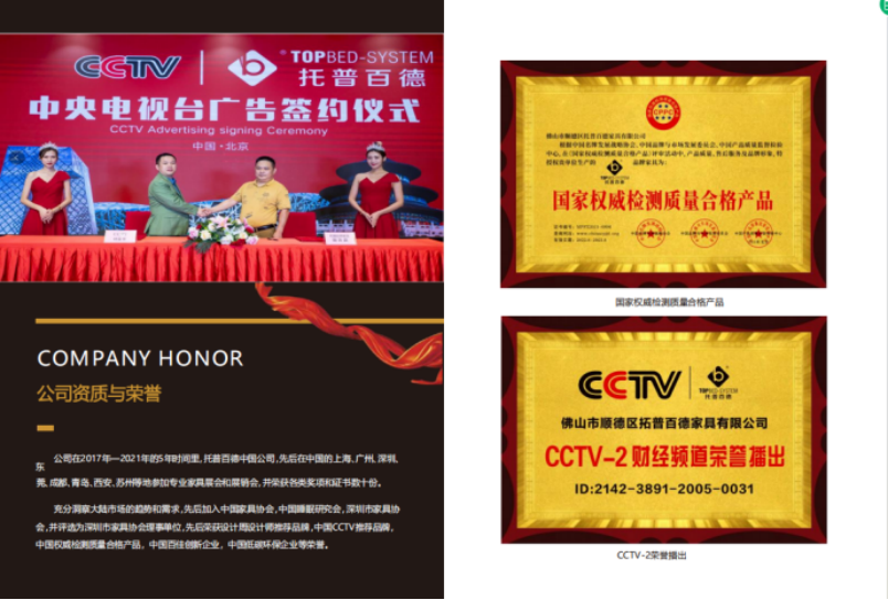 自成立至今,托普百德始终致力于为人们 提供系统化、科学化、高品质的睡眠解决方案, 为人们打造了舒适的睡眠体验。托普百德先后 投 资建设了中国广东佛山生产基地,生产 基地 均引入先进自动化、智能化生产设备,形 成了全面而完善的生产研发体系,为旗下品牌各渠道提供了强有力的产能支持。托普百德的 生产管理均严格践行国家品质标准,旗下产品 通过了国家检测机关检验,获得了市场与行业的高度认可,在中国国内先后荣膺中国 设中国 百佳改革创新企业、中国低碳环保产品、国家 权威监测质量合格产品、CCTV2荣誉 播出等国家级荣誉。