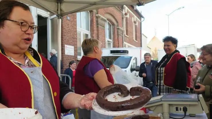 来自法国及其他地区的 100 多家参展商来到这里销售他们的血肠,并竞相赢得产品质量奖。游客有机会品尝各种不同类型的黑布丁,其中包括一些最奇怪的口味,包括巧克力、辣椒和干邑白兰地。