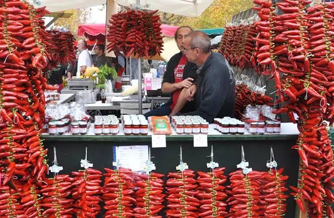 这个周末节日的特别亮点包括周日对胡椒丰收的祝福以及由 Confrérie du Piment d'Espelette 提供的服务。
