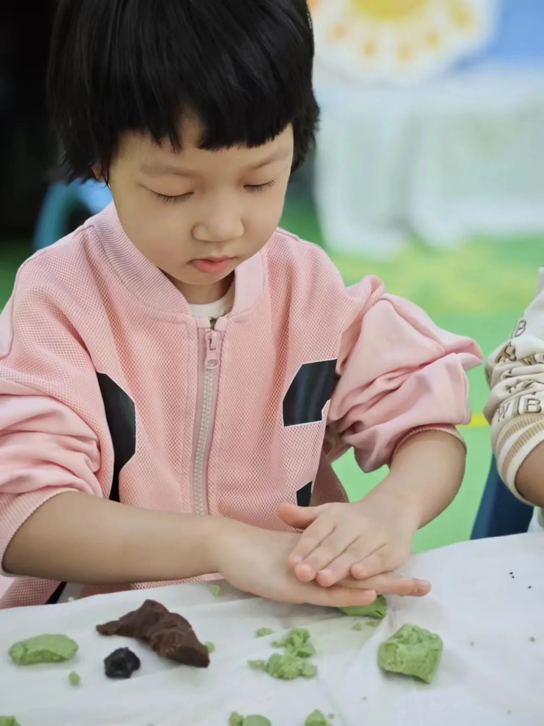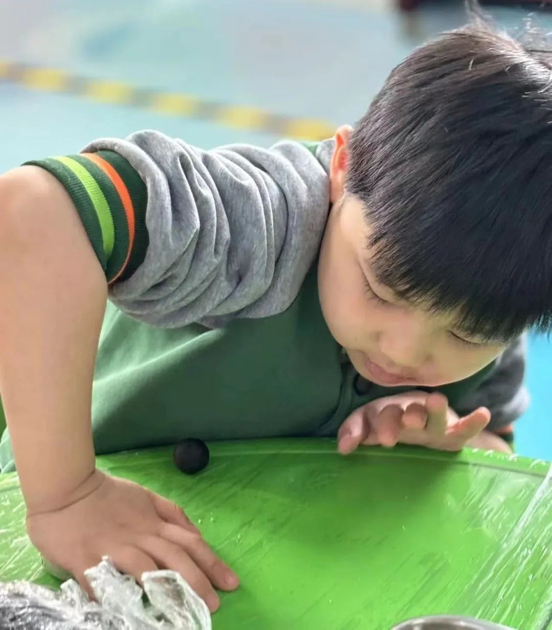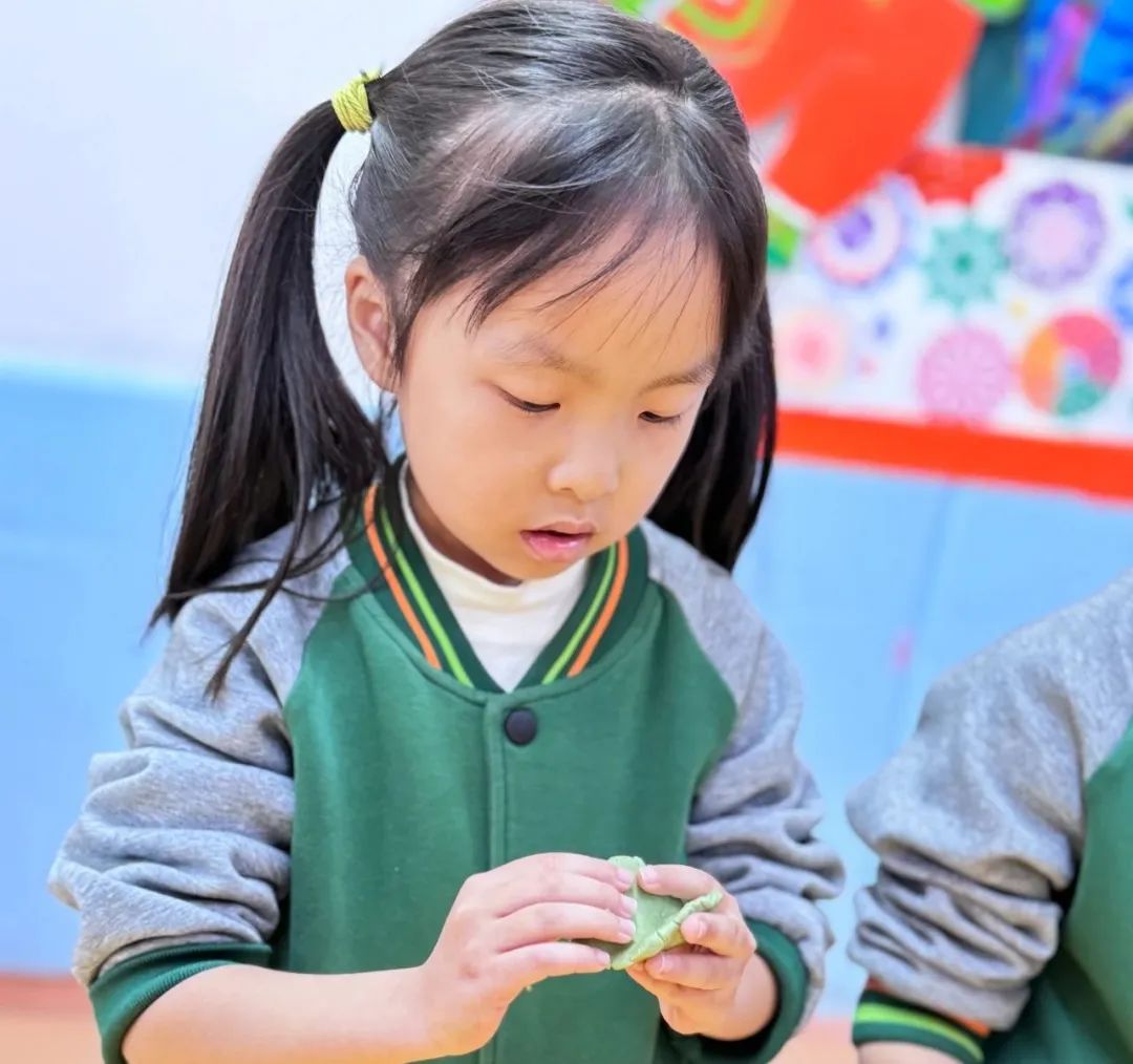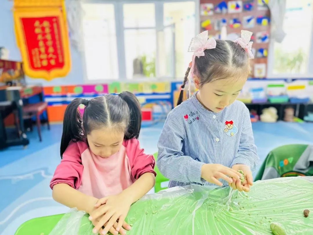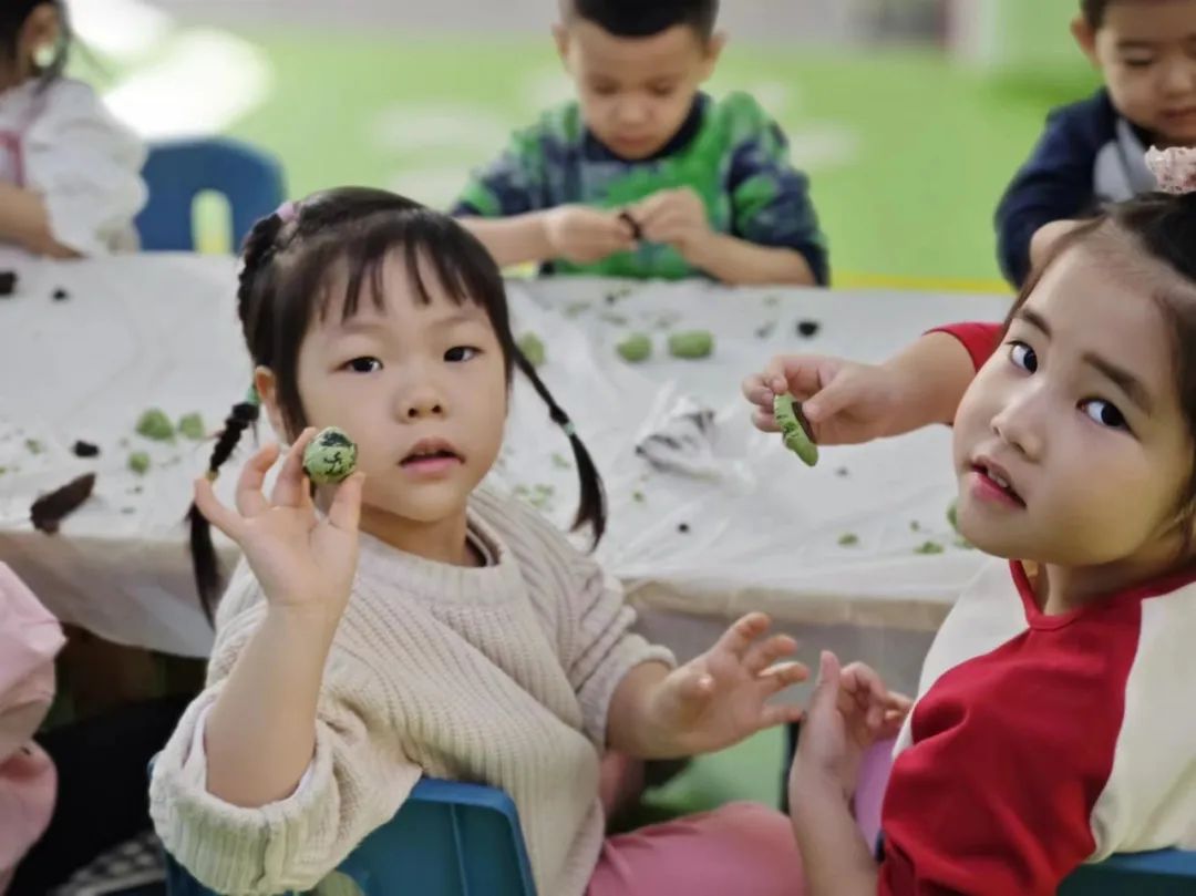 搓一搓,压压扁,放上馅,再搓圆。在孩子们的巧手下,一个个圆圆的青团就完成啦!