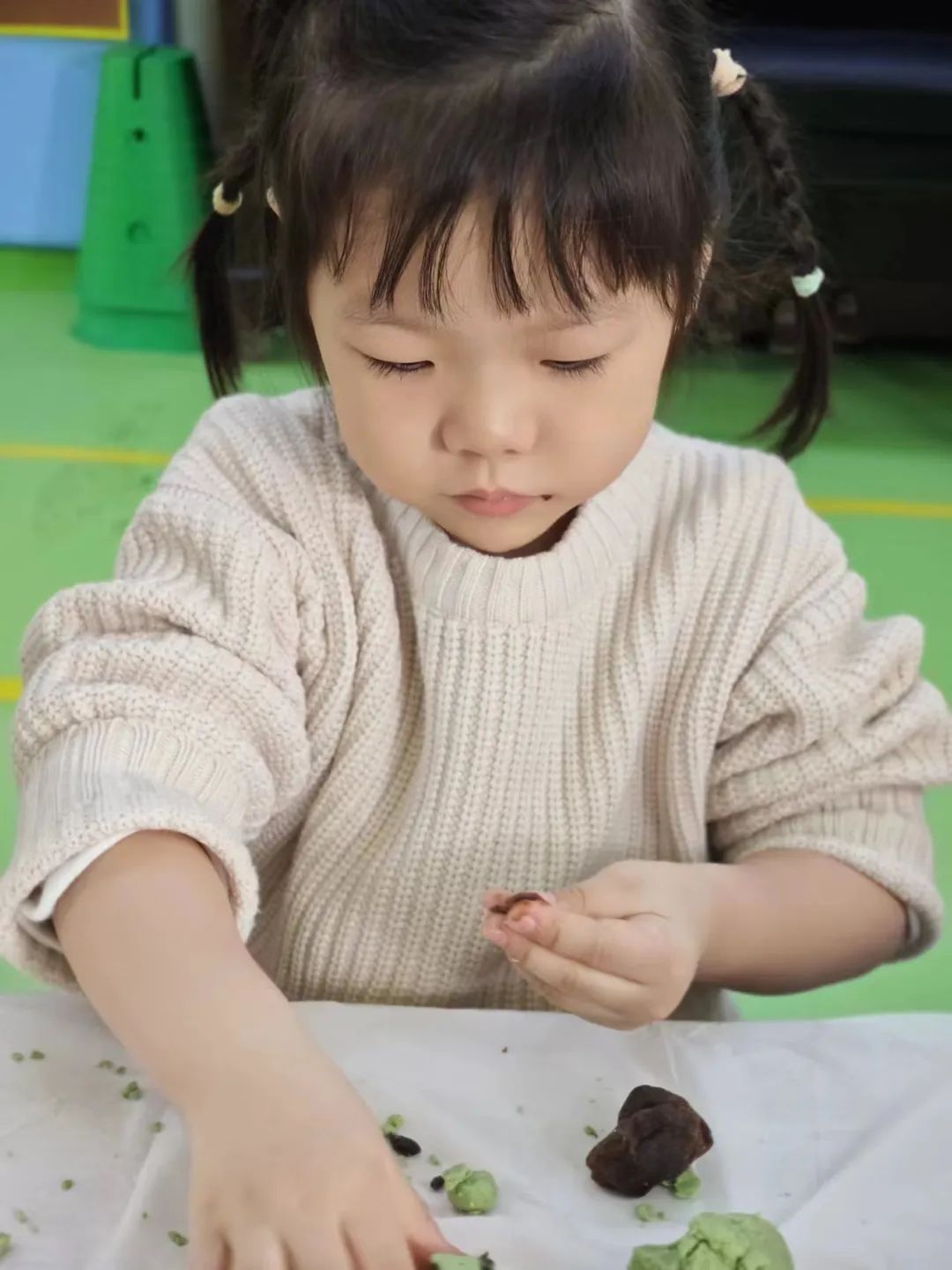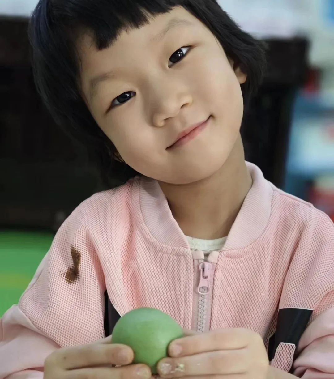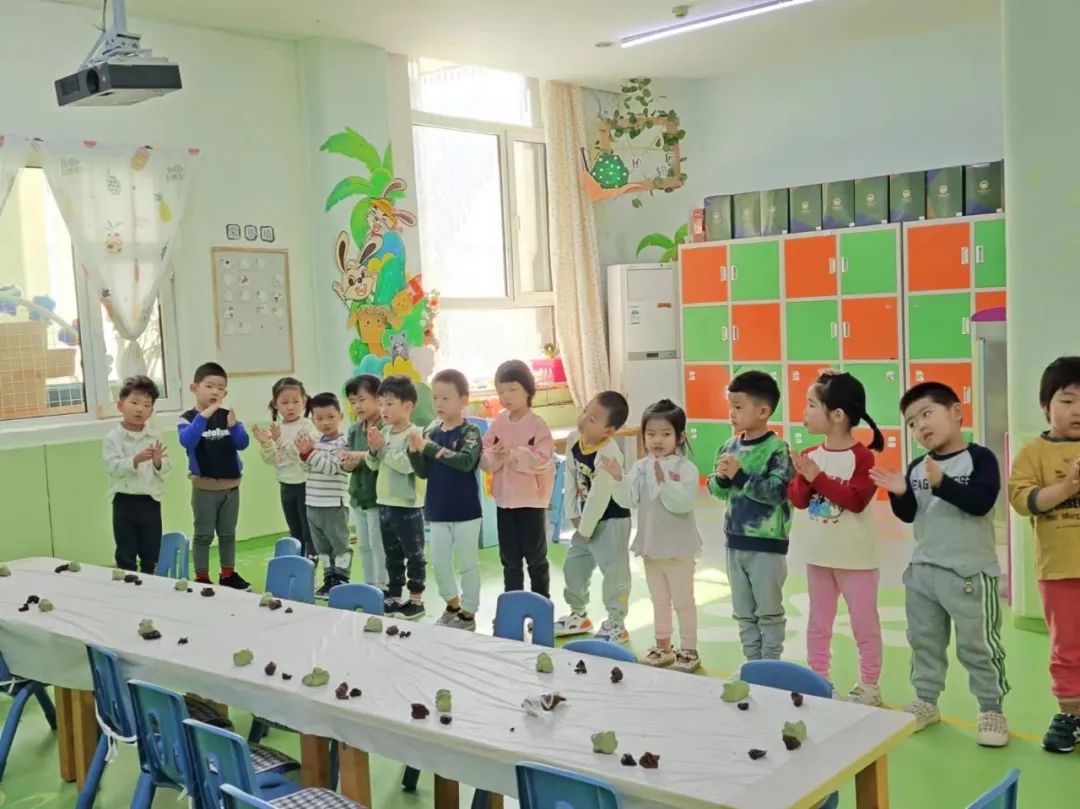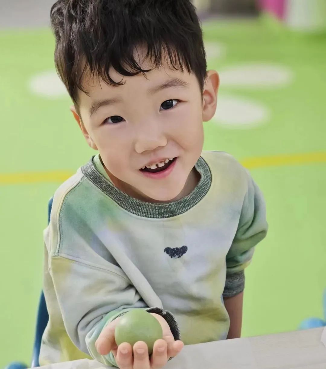 在宝贝们的辛勤劳动下,一个个绿油油、圆溜溜的小青团就做好了,宝贝们的脸上个个洋溢着成功的喜悦!
