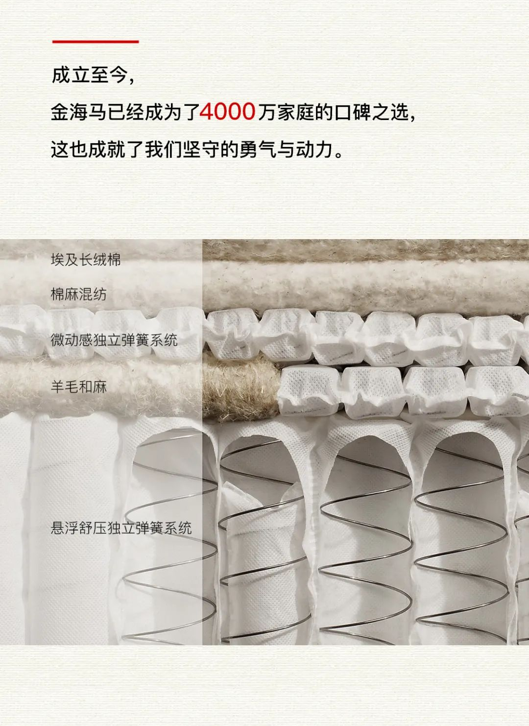 无数认证证书和奖项荣誉是金海马一步一个脚印的见证助眠系统、亲肤抗螨、呼吸系统、通风祛湿、舒压系统、舒缓压力、支撑系统、有力持久金海马开创的四大助眠系统让无数消费者好好睡觉我们一直在为“致力于改善人类睡眠”这一企业使命而不懈努力。