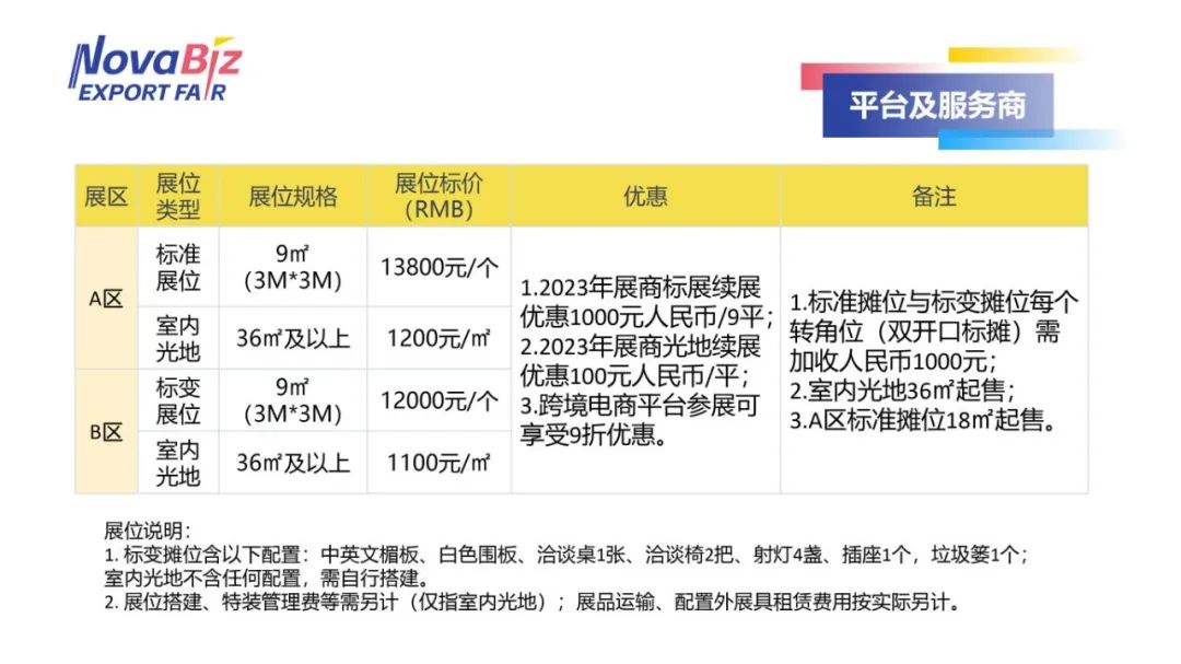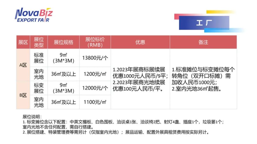 标准展位(B区):9㎡(3m×3m)人民币12,000元/个。