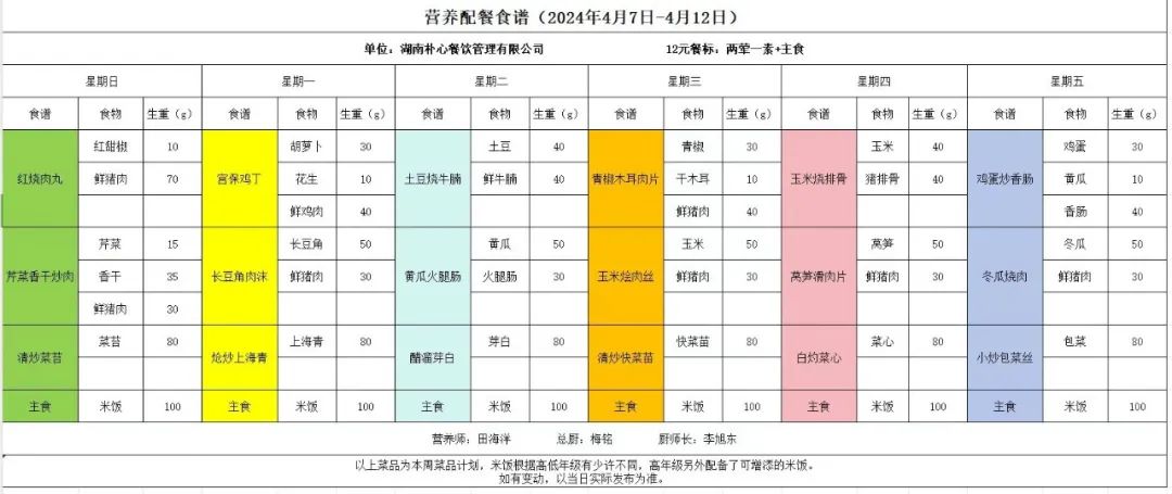 为进一步落实上级文件精神,加强学校配餐管理,确保学生营养均衡,提高学生就餐质量,现将湖南朴心餐饮管理有限公司一周菜谱进行公示,欢迎广大师生、家长提出宝贵意见。