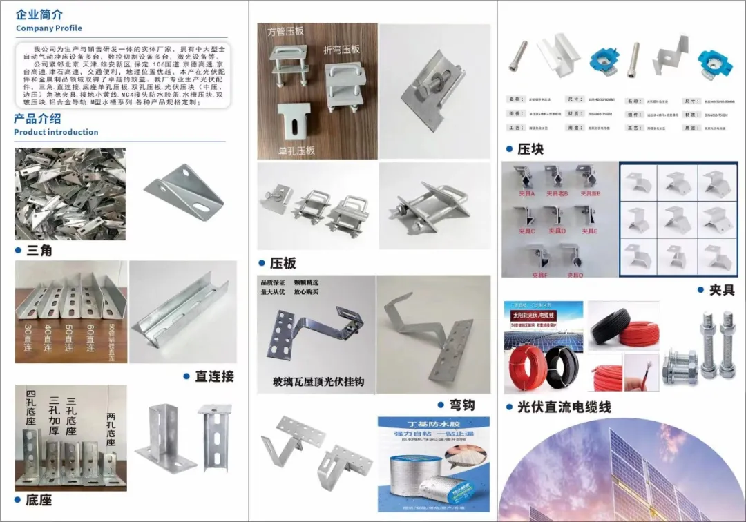 公司紧邻北京. 天津.雄安新区.保定.106国道.京德高速.京台高速.津石高速,交通便利,地理位置优越,本产在光伏配件和金属制品领域取得了卓越的效益。我厂专业生产光伏配件,三角.直连接. 底座.弯钩单孔压板.双孔压板.光伏压块(中压、边压)角驰夹具.接地小黄线.MC4接头防水胶条.水槽压块.双玻压块.铝合金导轨.M型水槽系列.各种产品规格定制;