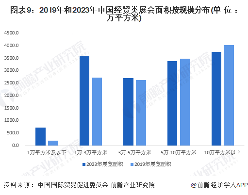 从展览数量来看,2023年,展览规模在1万平方米及以下小型展会和1万-3万平方米的中小型展会快速恢复,项目数量分别为914项和1720项,均超过2019年水平。