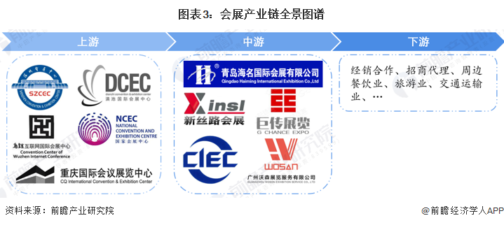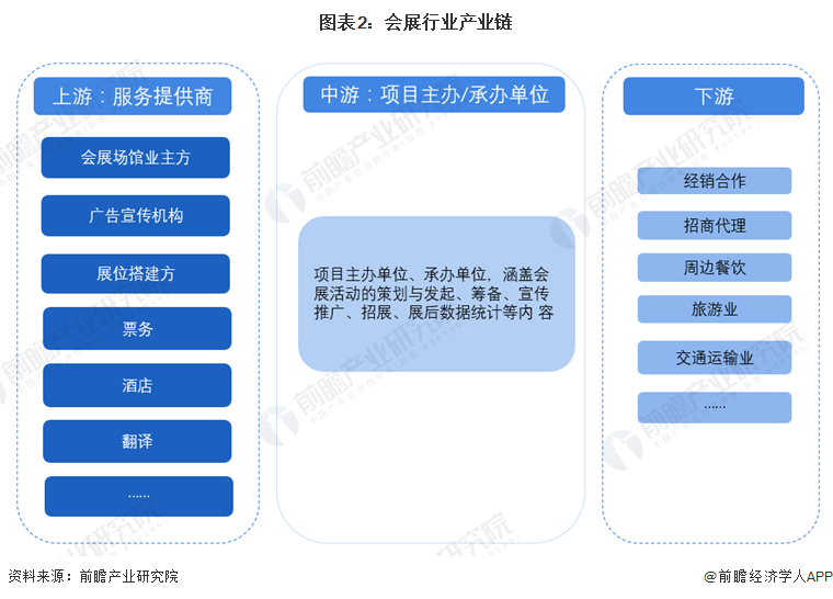 中国展览业作为促进交流合作的重要组成部分,已经成为构建现代市场体系和开放型经济体系的重要平台,在我国经济社会发展中的作用日益凸显。会展行业上游为场馆租赁商、展馆服务提供商,中游主要是会展主办单位和承办单位,下游有会展合作代理机构以及会展经济辐射范围以内的其他行业。
