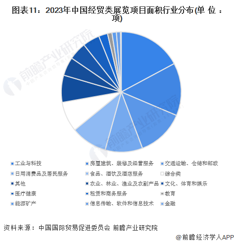 从展览面积来看,排名前五的展会类别同样为工业与科技,房屋建筑、装修及经营服务,交通运输、仓储和邮政,日用消费品及居民服务,食品、酒饮及酒店服务,占比分别为17.2%、14.2%、12.9%、10.1%和9.8%,前五大行业展览面积总占比为64.2%。
