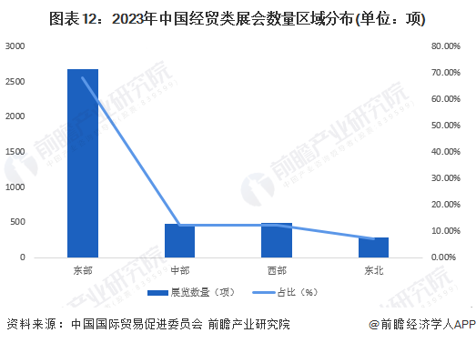 从展会数量看,2023年东部地区举办经贸类展会项目最多,共2678项,占国内经贸类展会总数的68.26%。中西部地区经贸类展会数量分别为476项和487项,占比分别为12.14%和12.41%,东北地区展会数量为282项,占比7.19%。