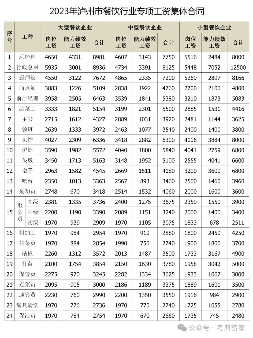 第三条 2023年泸州市餐饮企业工种分类月工资最低标准