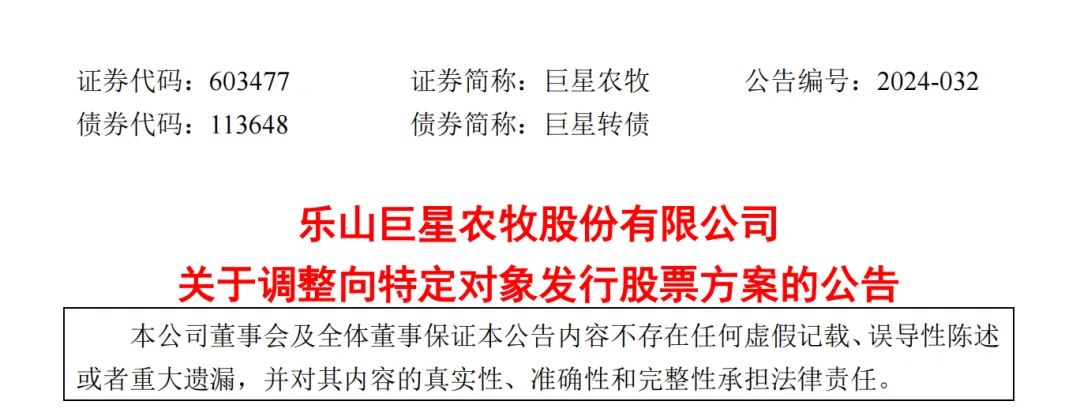 4月4日,巨星农牧发布调整向特定对象发行股票方案的公告,调整后,本次向特定对象发行股票募集资金总额不超过12亿元且不超过本次发行前公司总股本的30%。