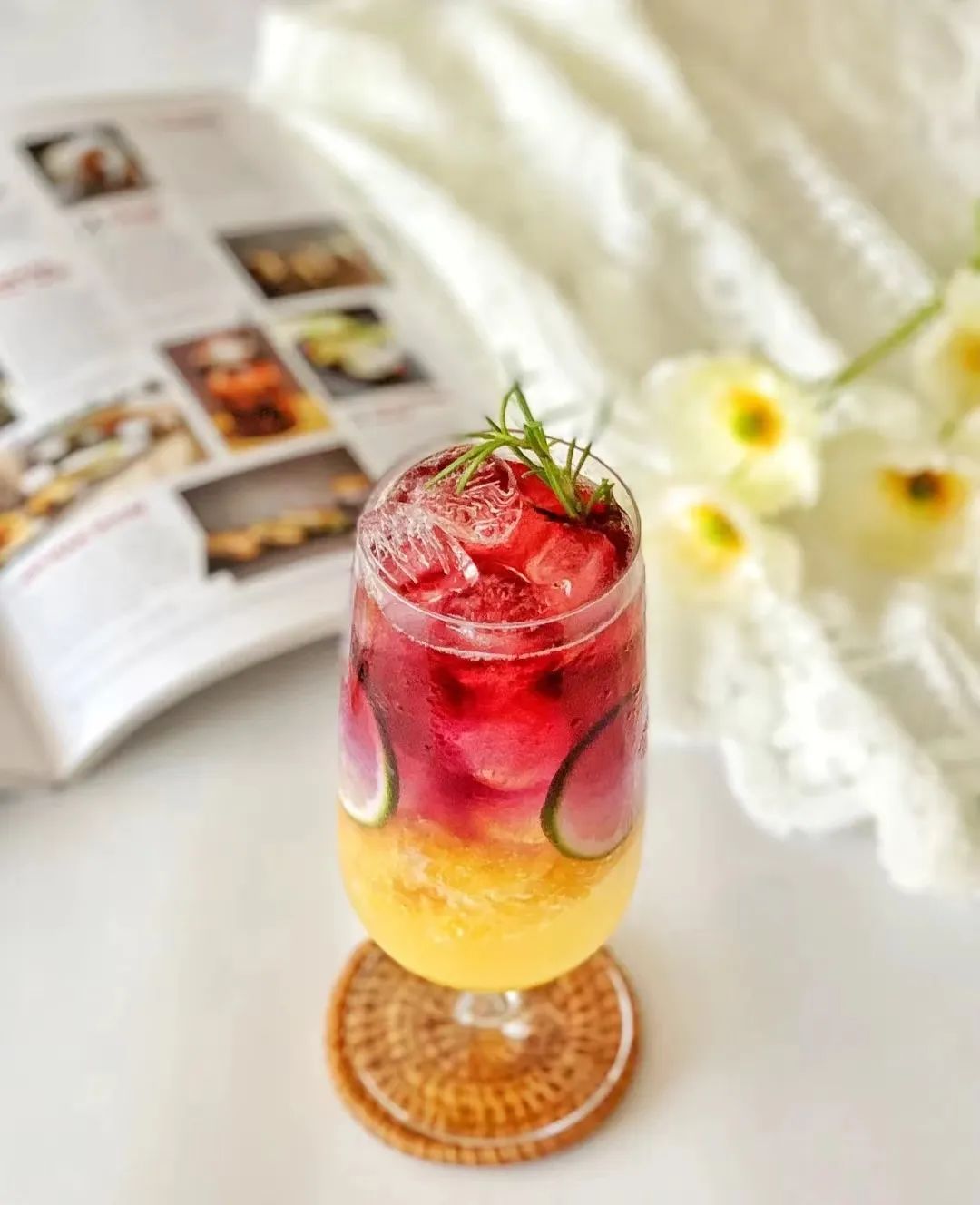 步骤:蝶豆花提前泡水备用,在杯中放入香橙果肉捣碎出汁,然后放入冰块以及青柠片。倒入雪碧六分满,倒入蝶豆花水八分满,再倒入红酒,装饰迷迭香即可。