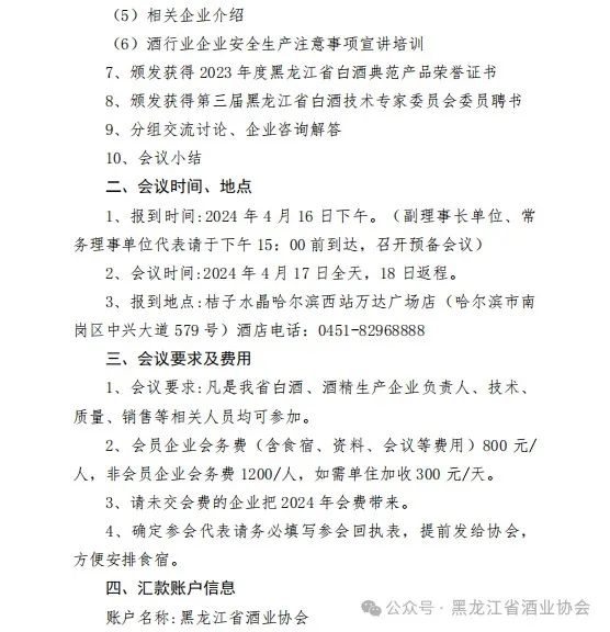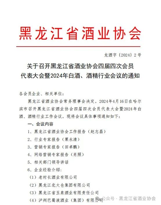 关于召开黑龙江省酒业协会四届四次会员代表大会暨2024年白酒、酒精行业会议的通知