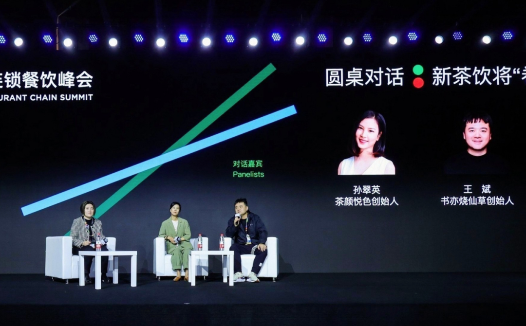 在圆桌对话环节,协会餐饮部主任孙工贺作为主持人,与茶颜悦色创始人孙翠英,书亦烧仙草创始人王斌就“新茶饮将‘卷’到何方”这一话题展开深入讨论。