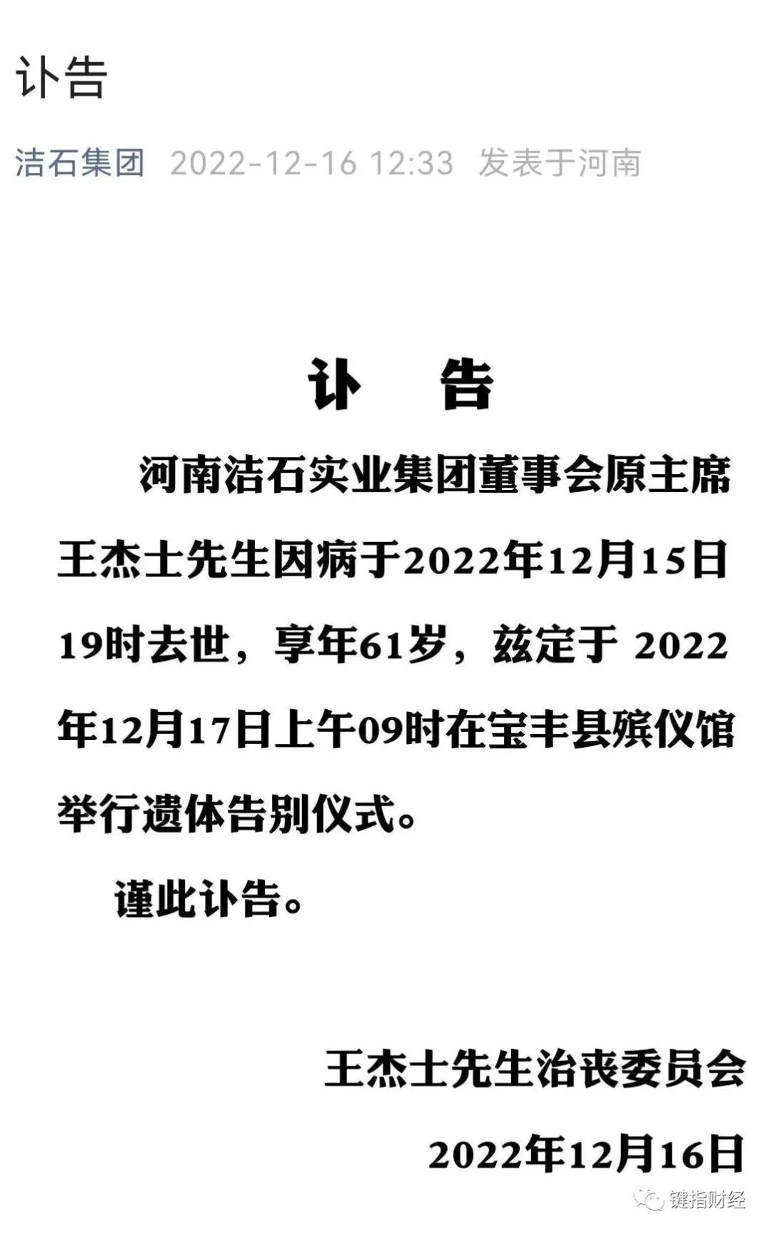 12月15日,其母公司河南洁石实业集团的董事会主席王杰士因术后感染新冠,医治无效在北京去世,享年61岁。