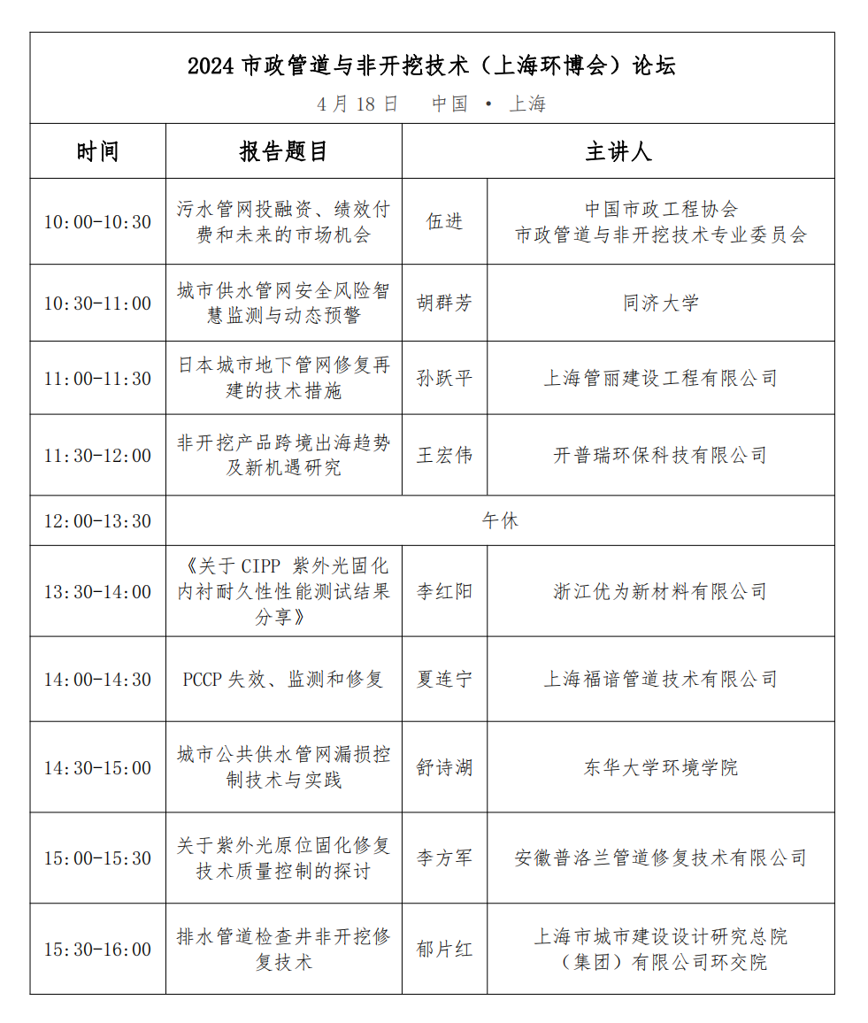 为推动我国市政管道与非开挖技术的发展,促进行业交流合作,中国市政工程协会市政管道与非开挖技术专业委员会(以下简称“专委会”)与中国环博会再度合作,兹定于2024年4月18日在上海新国际博览中心W4馆召开“2024市政管道与非开挖技术(上海环博会)论坛”。此次论坛将邀请知名专家学者、行业领袖就污水管网投融资、城市供水管网安全风险智慧监测等议题进行深入交流和探讨,分享最新技术成果,推动市政管道与非开挖技术的创新与应用。