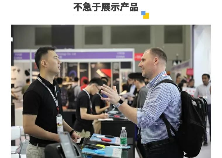 假如能够碰到头衔是总监(Director),副总裁(Vice President)等高管级别的客户,要多说一些战略性的内容。这些人来参观展会基本不是为了采购 1 个柜、2 个柜的货物,更重要的是来寻找战略性伙伴,展商要有“放长线钓大鱼”的功力,争取达成稳定合作关系。