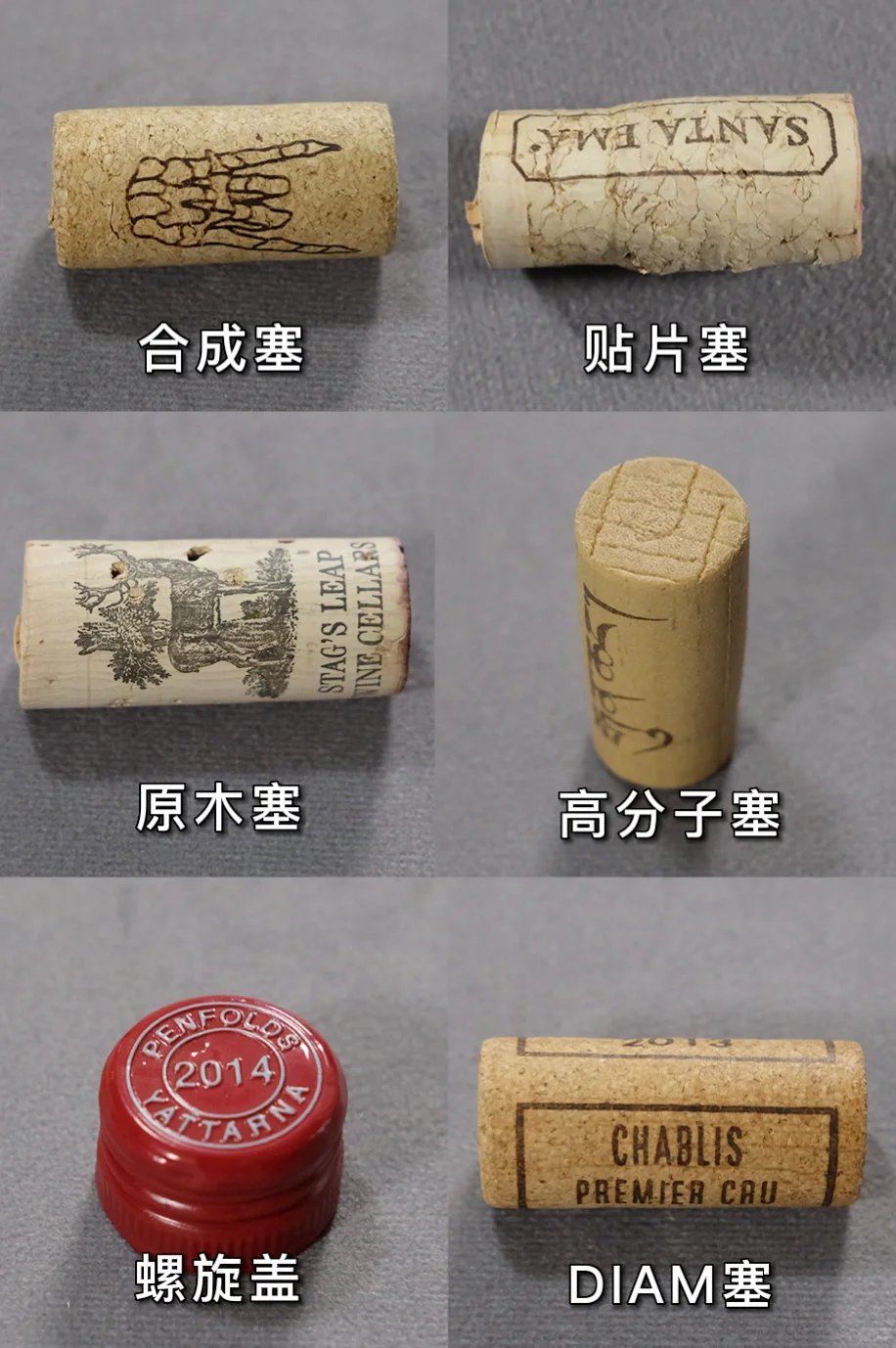 能啊!好酒配好塞,给大家看看这几种常见的塞子,有合成塞、贴片塞、天然软木塞、高分子塞、螺旋盖、DIAM塞。挨个说说。
