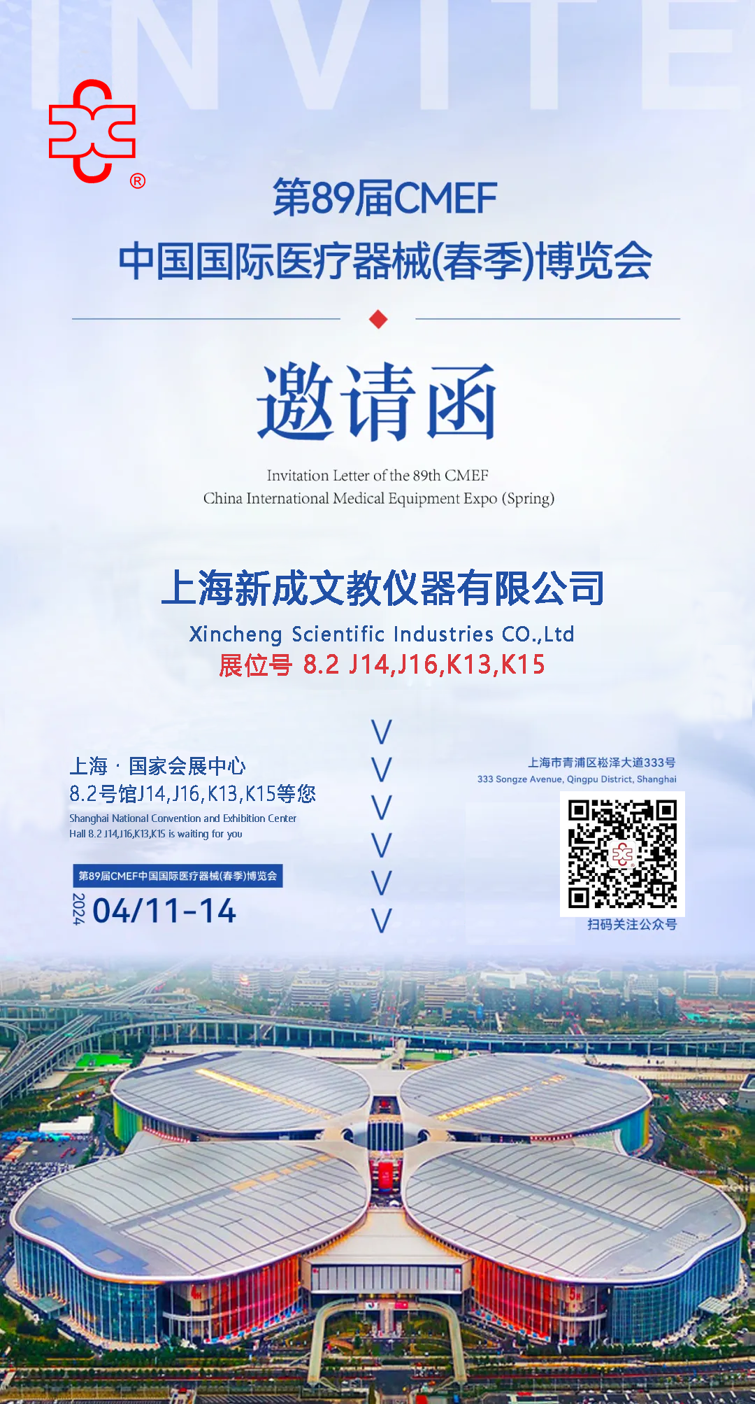 新成文教诚挚邀请您参加第89届中国国际医疗器械博览会(CMEF),本期CMEF将于2024年4月11日至14日在上海国家会展中心举行,与您相约在8.2 J14,J16,K13,K15展台,期待您的莅临!