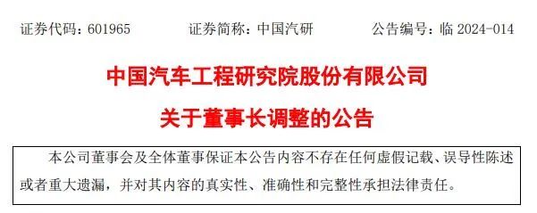 文章来源:《中国汽车工程研究院股份有限公司关于董事长调整的公告》