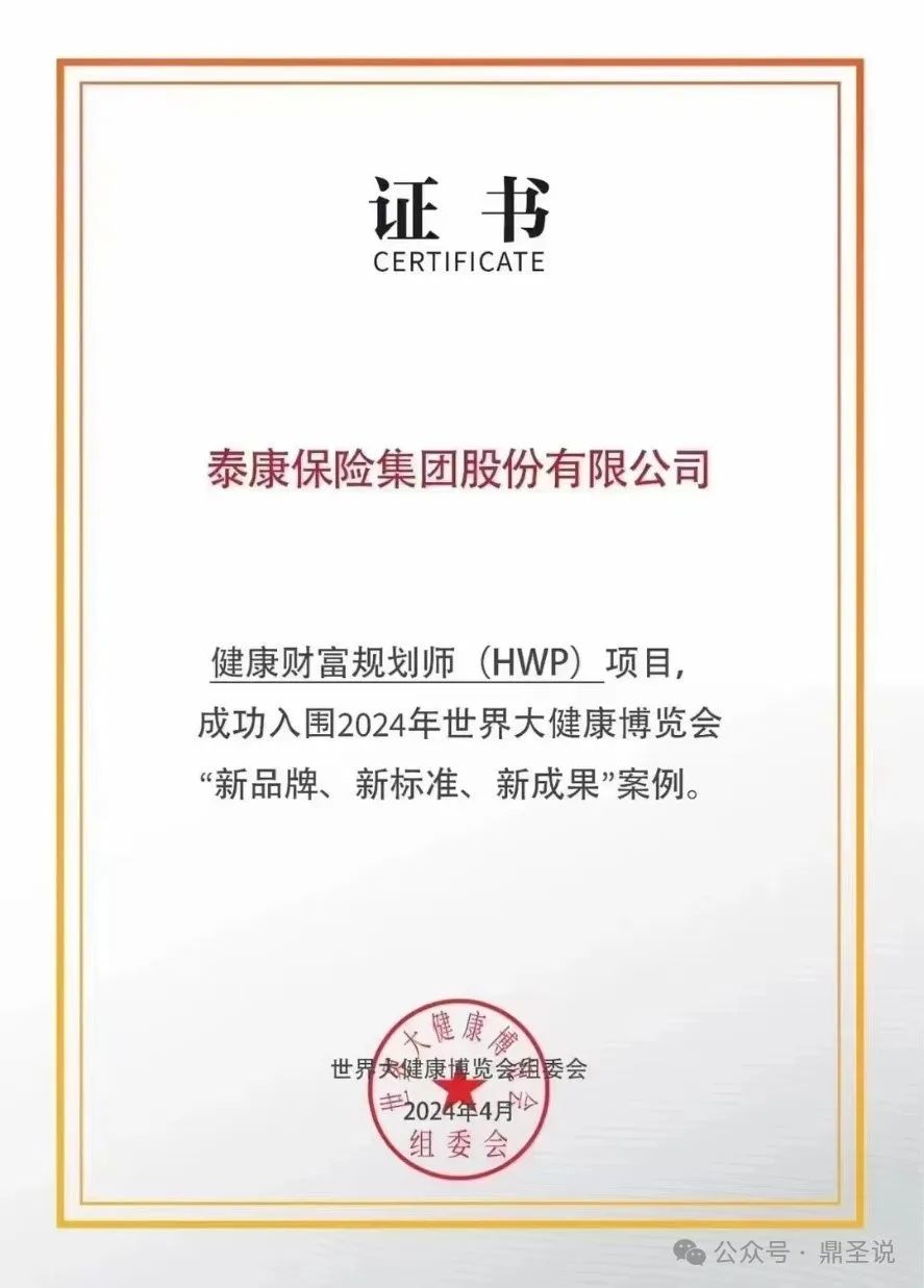 您知道吗,咱们泰康的健康财富规划师(HWP)项目,已经成功入围2024年世界大健康博览会“新品牌、新标准、新成果”案例啦!