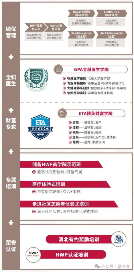 当然会,公司有一整套完善的专业化培训体系。在绩优管理端,我们有优秀新人、卓越行销、卓越管理三条清晰完善的成长路径;在全科医生端,我们成立了GPA全科医生学院,让HWP能够走进医院;在财富专家端,我们推出了ETA精英财富学院,围绕四商一质整合泰康财富生态资源,提升HWP的财务分析与资产配置能力。 别急还有呢。为了进一步提升HWP的技能和认知,不仅组织HWP走进社区,完成沉浸式社区体验培训,充分了解泰康大健康生态及其发展,还与清华大学、北京大学以及海外学院进行合作,为顶尖HWP提供北大、清华以及海外的培训机会,逐步打造HWP从在校到在职、从基础人才储备到专业人才提升的完整培养链条。