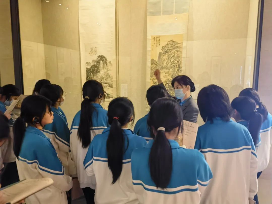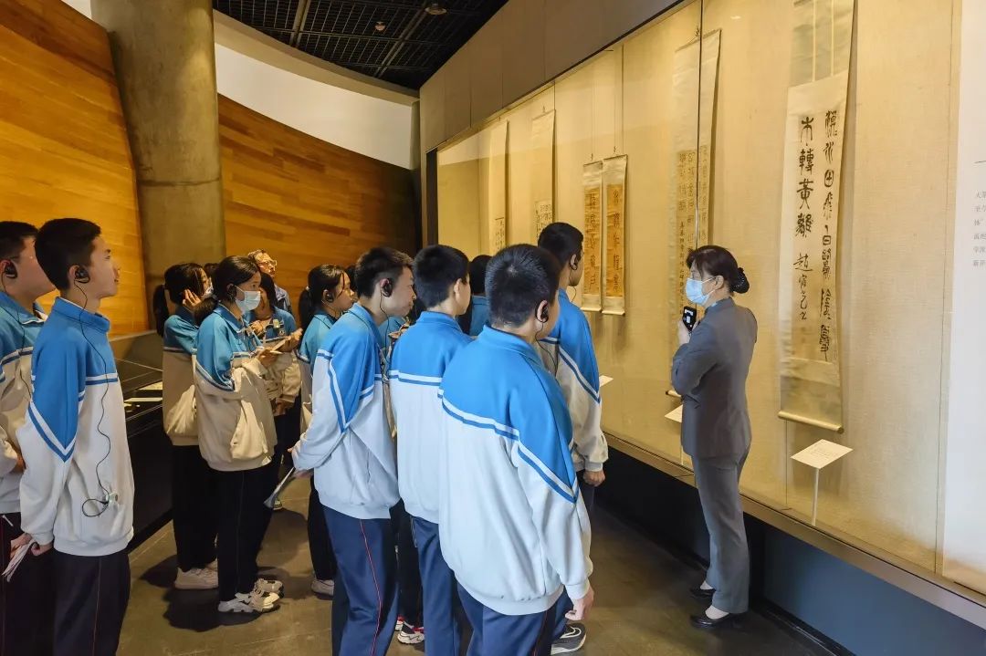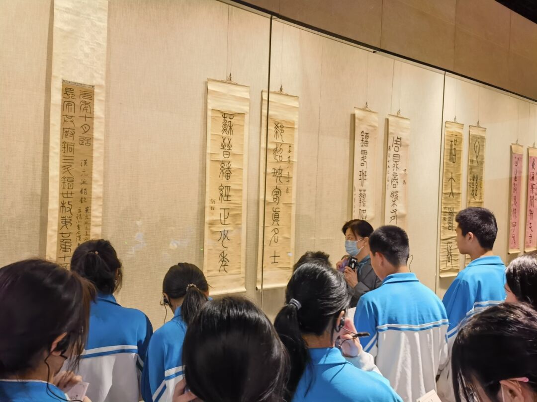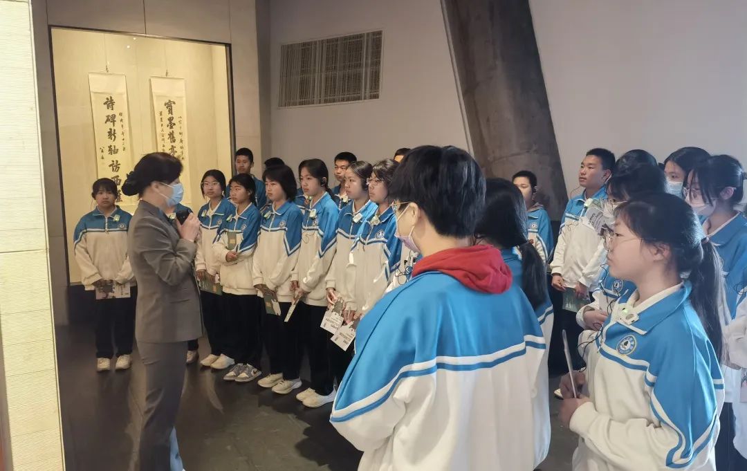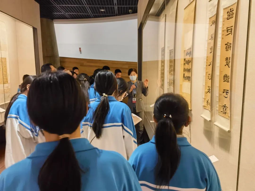 在首博老师的带领下,同学们井然有序地参观了金石书法和近现代名家绘画作品展。穿梭于瑰丽多姿的展厅中,同学们津津有味地聆听老师声情并茂的介绍,逐渐了解金石书法和绘画的历史渊源和独特之处。讲解员会详细介绍起源、发展以及不同的艺术风格,让学生对这些古老的艺术形式有了更加深入的了解。