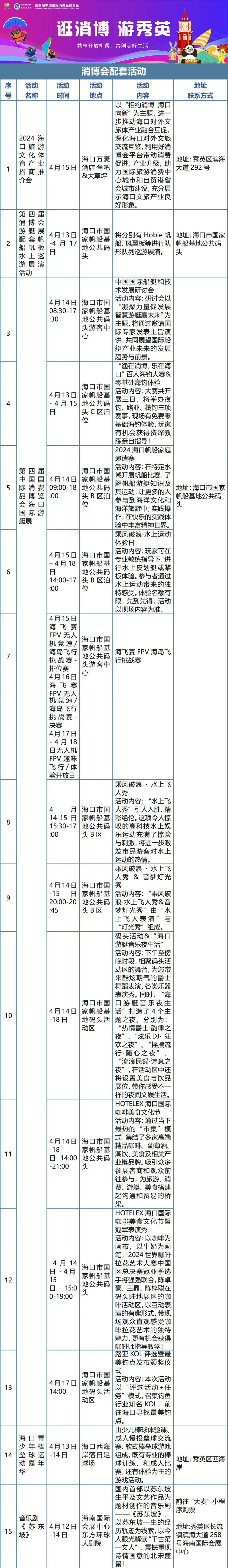 为了营造消博会热闹的欢乐氛围,第四届消博会游艇展配套帆船帆板水上巡游展演活动也将同期举行,Hobie帆船、风翼板等进行队形队列巡游展演,参展商及宾客可近距离进行观赏。除此之外,海口青少年棒垒球运动嘉年华活动也将于4月13日至4月15日在西海岸落日足球场举行,既有专业的棒球训练和成人比赛,又有体验为主的游戏活动,为市民游客提供一个欢乐、有趣的运动体验。此外,在海南国际会展中心东方环球大剧院里,一场别开生面的音乐剧《苏东坡》也将上演,震撼重现诗情画意的北宋盛景!