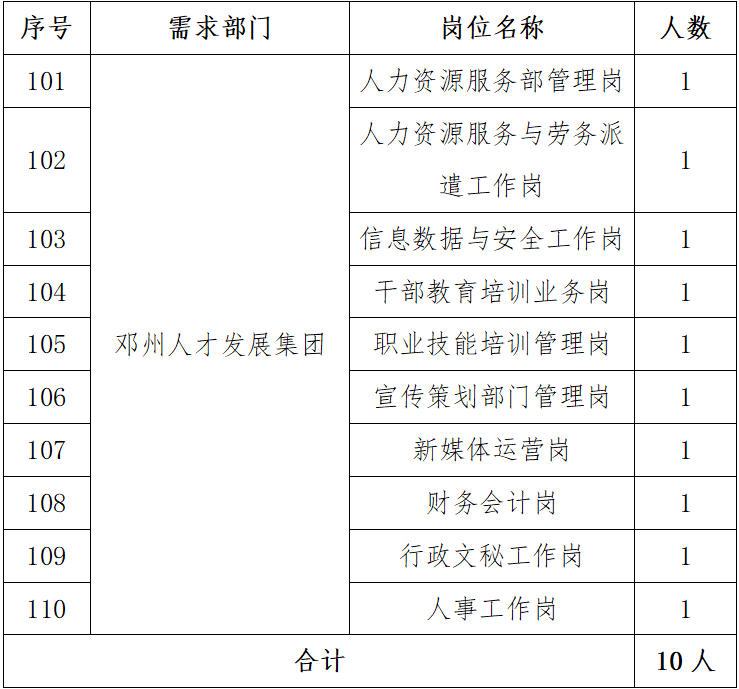 东风浩荡征帆满,广揽人才谱新篇。集团坚持“搭台赋能、聚才兴邓”理念,瞄准“人才市场化的引领主体、人才专业化的服务团队、人才产业化的开发平台、人才信息化的智创中心”四个定位,聚焦“高端人才招引、人才资源开发、人才政策服务、人才教育培训、人才项目投资、人才实体运营、人才数据储备、人才分析测评”等核心业务,构建起企业发展“四梁八柱”,充分发挥邓州“人口大市”优势,打造邓州人才品牌。为邓州高质量发展提供强有力的人才智力支撑。为提升公司人才队伍建设水平,选拔引入素质高、业务精、能力强的优秀人才,促进公司高质量发展,根据公司发展需要,现面向社会公开招聘工作人员10名。现将有关事项公告如下:1.具有中华人民共和国国籍,拥护中国共产党的领导,政治立场坚定,具有较高的政治素质和职业操守。2.遵纪守法,品行端正,勤奋敬业,勇于担当,清正廉洁,无违规违纪违法等不良记录。3.具有符合岗位要求的工作能力和专业技能,能独立开展相应岗位的工作。4.具有良好的综合素质、学习能力、敬业精神和团队协作意识,认同邓州人才发展集团企业文化和发展理念。5.具有健康的身体条件和职业心态,心理承受与调适能力较强,能够适应复杂环境,胜任繁重工作。6.与其他单位和经济组织均不存在劳动关系或者兼职行为。1.正在接受司法机关和纪检监察机关立案审查尚未结案的。3.曾因犯罪受过刑事处罚的人员和曾被开除党籍公职的人员、受到党纪政纪处分期限未满或者正在接受纪律审查的人员、处于刑事处罚期间或者涉嫌违法犯罪正在接受司法调查尚未作出结论的人员。4.近年在公务员招录、事业单位公开招聘考试中被认定有舞弊等严重违反招聘纪律行为的人员。6.存在法律法规、党纪政纪和有关政策规定不得聘用的其他情形。7.报名人员具有《公司法》第一百四十六条所列情形之一的:由于个人原因,导致企业出现严重亏损,或造成企业资产严重流失和重大经济损失的,个人在企业经营管理活动中有弄虚作假记录的。10.患有《公务员录用体检通用标准(试行)》规定列为不合格的疾病的。1.年龄的计算方式:35周岁以下(即1989年3月31日以后出生);40周岁以下(即1984年3月31日以后出生)。条件优秀者可适当放宽年龄限制。2.工作经验年限按足年足月累计计算,不包括在校期间的社会实践、实习、兼职等经历。工作履历需从毕业当年填写,填写时间应连贯。备注:凡涉及时间计算的,统一截止到2024年3月31日。本次计划面向社会公开招聘10人,招聘部门、岗位、人数如下表,学历、专业、任职资格等具体要求详见:附件1《邓州人才发展集团有限公司2024年公开招聘岗位计划表》。本次招聘按照发布公告、网上报名、资格审查、笔试、面试、背景调查、体检、公示、录用等程序进行。本次招聘全程委托智联招聘通过其各个渠道发布招聘公告。1.报名时间:2024年4月2日至4月15日18:00,逾期不再受理。2.报名方式:请登录网址 https://dzrcfzjt.zhaopin.com,进行注册并在线报名,同时上传如下材料:(2)本人毕业证、学位证及《教育部学历证书电子注册备案表》(有多个教育经历的,要提供全部学历毕业证、学位证书、《教育部学历证书电子注册备案表》;留学回国人员需提供由教育部留学服务中心认证的《国外学历学位认证书》)。(3)职(执)业资格证、专业技术资格(职称)证书、主要荣誉证书等。(4)填写工作经历时,必须包含以下内容:曾任职单位、任职时间、任职岗位或职务、岗位职责、具体工作内容、工作成果,提供相关作品、成功案例等详细佐证资料。本次报名通过线上方式进行,结合招聘岗位的任职条件,对报考人员的报名材料进行资格审查。资格审查将贯穿招聘全程,一经发现报考人员不符合公告规定或不符合招聘岗位资格条件或提供虚假信息,立即取消报考人员考试、聘用资格或解除聘用合同,并视情况追究有关人员的责任。通过资格审查的报考人员进入下一环节,资格审查未通过者不再另行通知。笔试以闭卷方式进行,按照资格审查结果原则上以1:6比例进入笔试环节(根据实际报名情况比例可进行适当调整),笔试内容为公共基础知识,主要考察报考人员的政策理论水平、分析和解决实际问题的能力,笔试总成绩100分。所有岗位将根据应聘人员的笔试成绩从高到低排名确定人选,面试人选原则上以1:3比例进入面试环节(如报名应聘人员放弃面试资格,将按成绩从高到低的顺序依次递补),笔试成绩并列者,一并进入面试。不足1:3时,按照实有人数确定面试人选。综合成绩由笔试成绩和面试成绩组成,其中笔试成绩占比40%,面试成绩占比60%。综合成绩相同的,按照面试成绩从高分到低分的顺序排名。笔试和面试成绩完全相同的,由招聘单位依据岗位匹配度等综合确定排名,综合成绩低于70分者不予录用。按照程序对拟录用人员进行背景调查(考察),考察结果不合格或主动放弃的,按照该岗位综合成绩由高到低的顺序进行递补。体检参照公务员录用体检通用标准(试行)的规定到指定医院进行体检,体检费用自理。若有体检不合格者,按综合成绩由高到低的顺序依次递补或核减该岗位招聘计划。对拟聘用人员名单在邓州人才集团公众号官网进行为期5个工作日的公示。被确定为聘用对象的人员,经公示无异议后,按规定办理聘用手续,签订劳动合