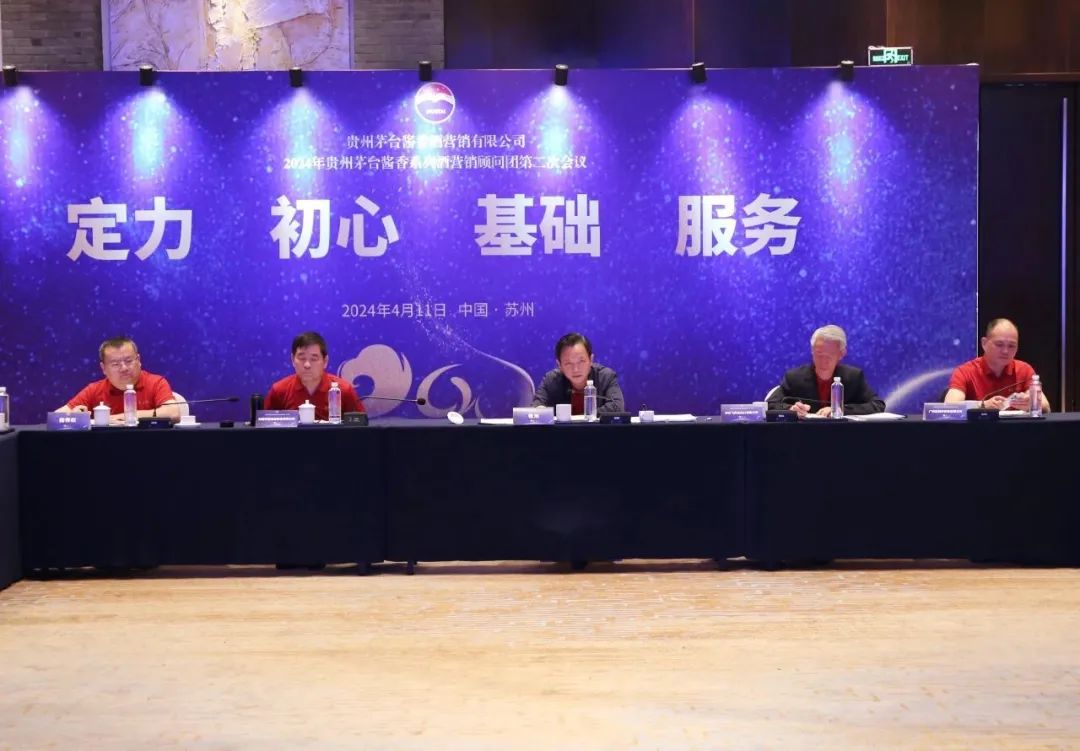 4月11日下午,召开以“定力 初心 基础 服务”为主题的2024年茅台酱香系列酒营销顾问团第二次会议。酱香酒公司党委书记、董事长张旭出席并讲话,党委委员、副总经理杨秀权,顾问团团长李秋水,顾问团名誉团长王庆云出席会议,顾问团秘书长刘家生主持会议。