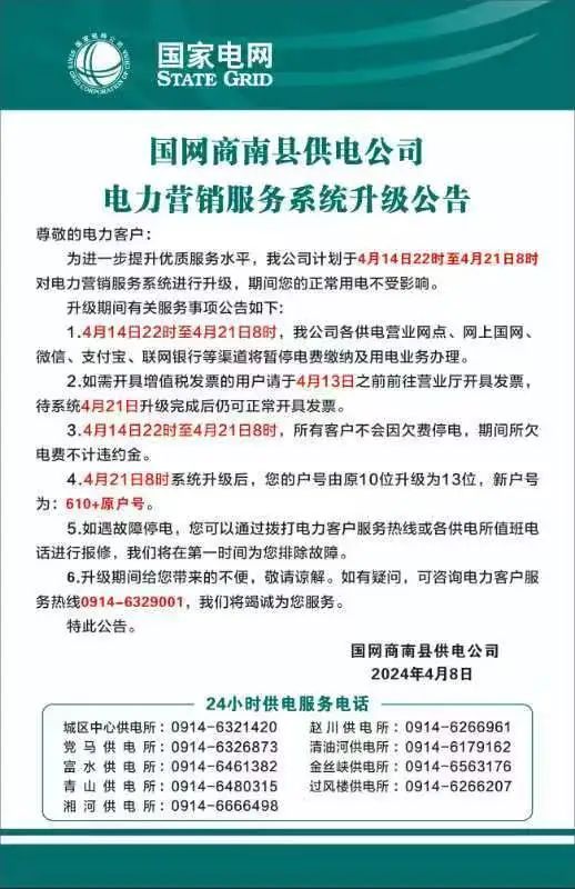 升级期间给您带来的不便,敬请谅解。如有疑问,可咨询电力客户服务热线0914-6329001,我们将竭诚为您服务。