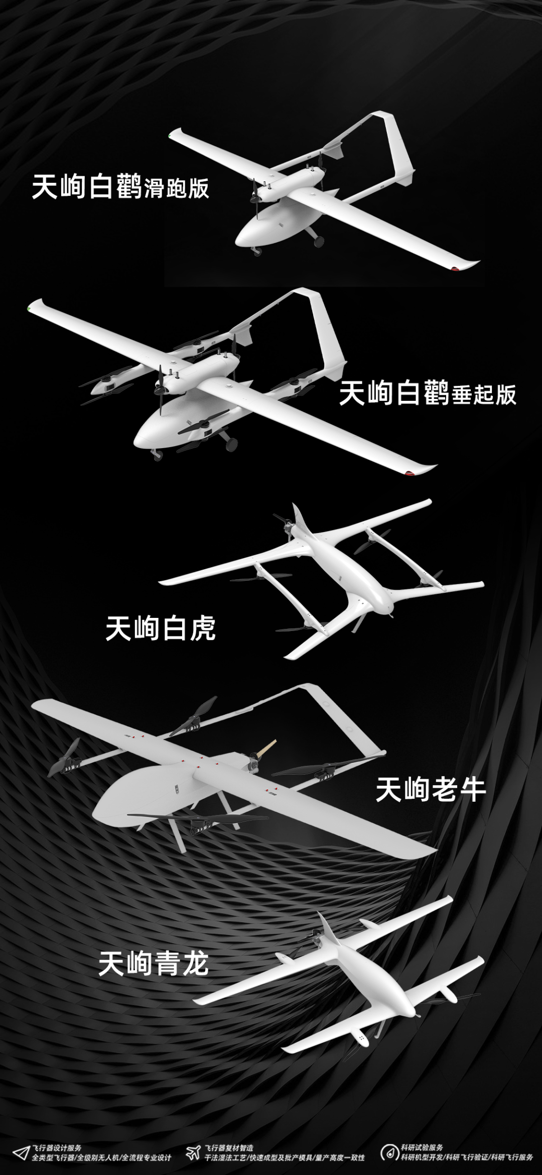 天峋机体平台,涵盖了2kg—180kg的产品序列,包括固定翼、复合翼等多类型自研产品。