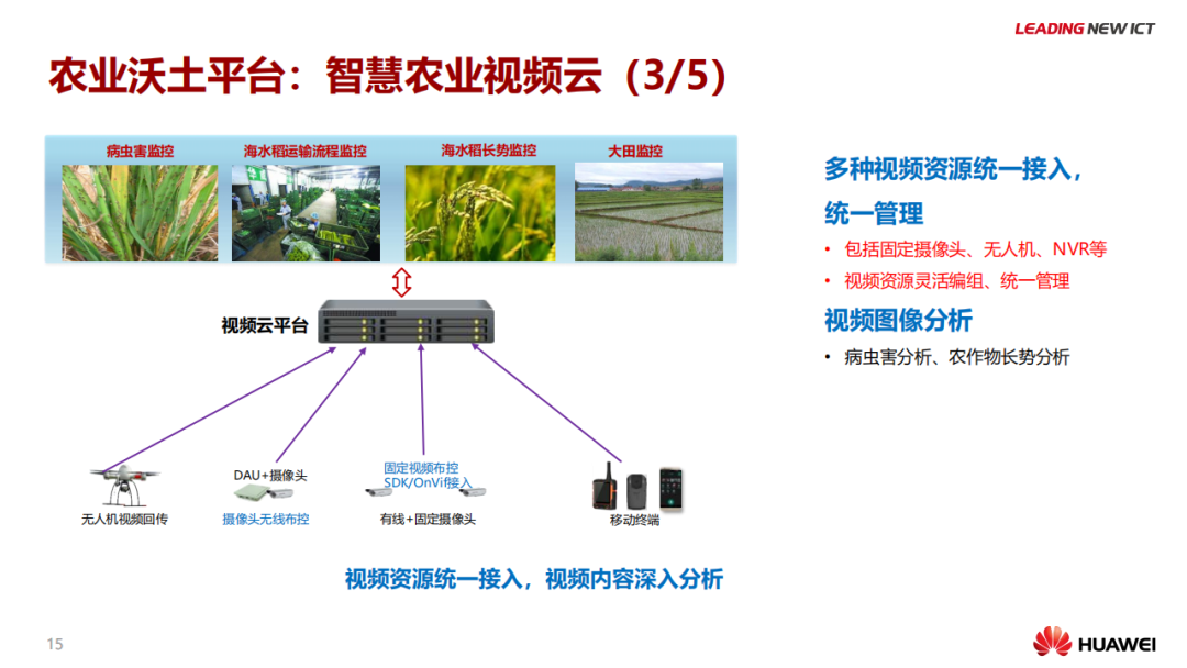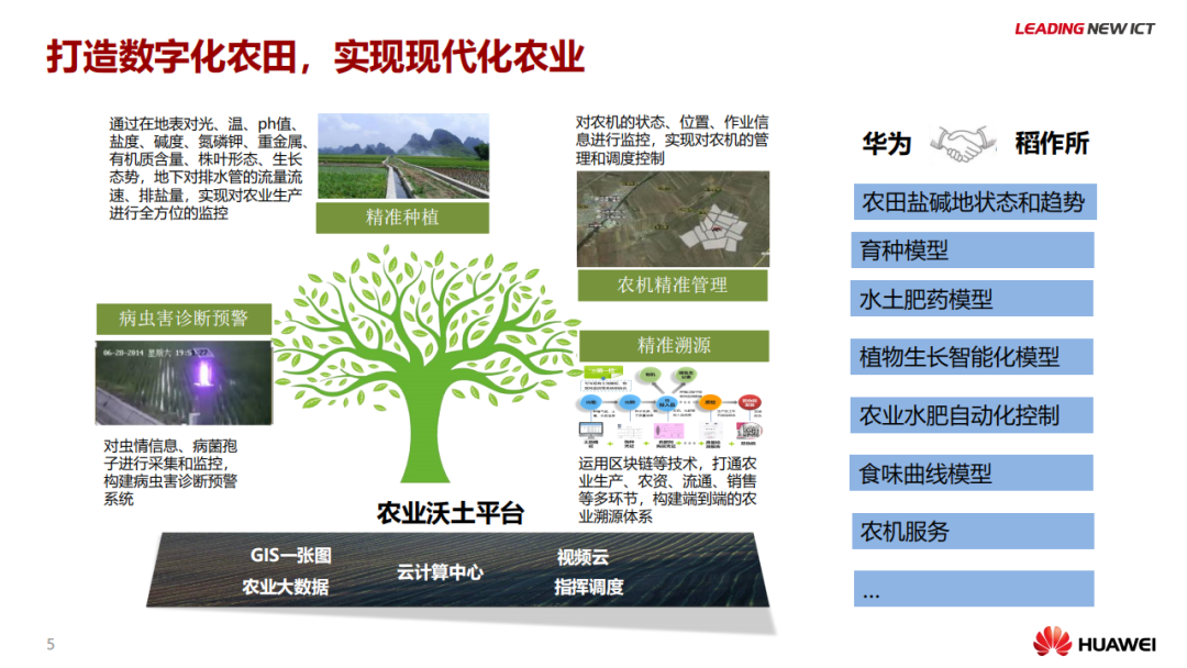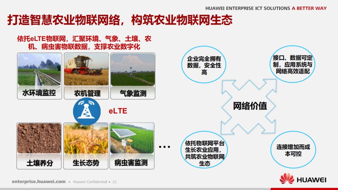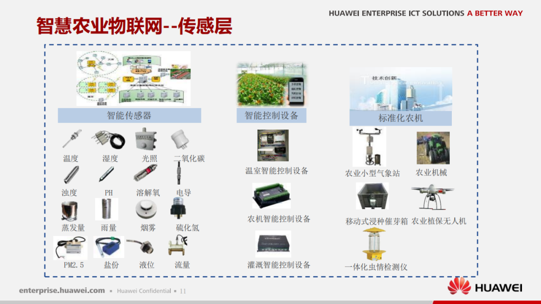 物联网有望成为促进农业提产、实现供需平衡的关键使能技术。智慧农业采用了基于物联网的先进技术和解决方案,通过实时收集并分析现场数据及部署指挥机制的方式,达到提升运营效率、扩大收益、降低损耗的目的。可变速率、精准农业、智能灌溉、智能温室等多种基于物联网的应用将推动农业流程改进。物联网科技可用于解决农业领域特有问题,打造基于物联网的智慧农场,实现作物质量和产量双丰收。本文推荐华为智慧农业解决方案,供参考。