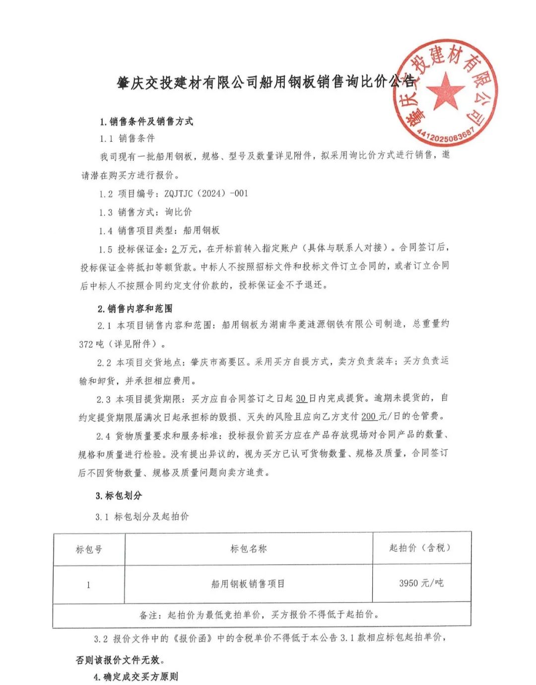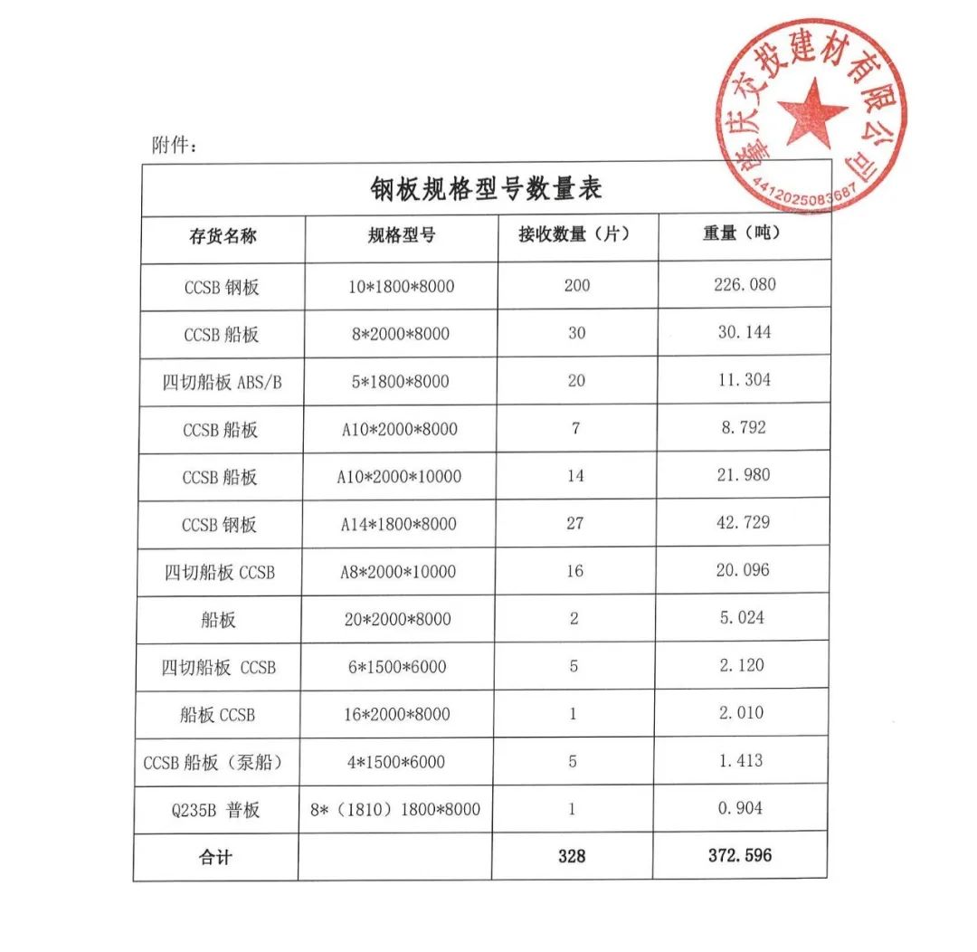 肇庆交投建材有限公司船用钢板销售询比价公告