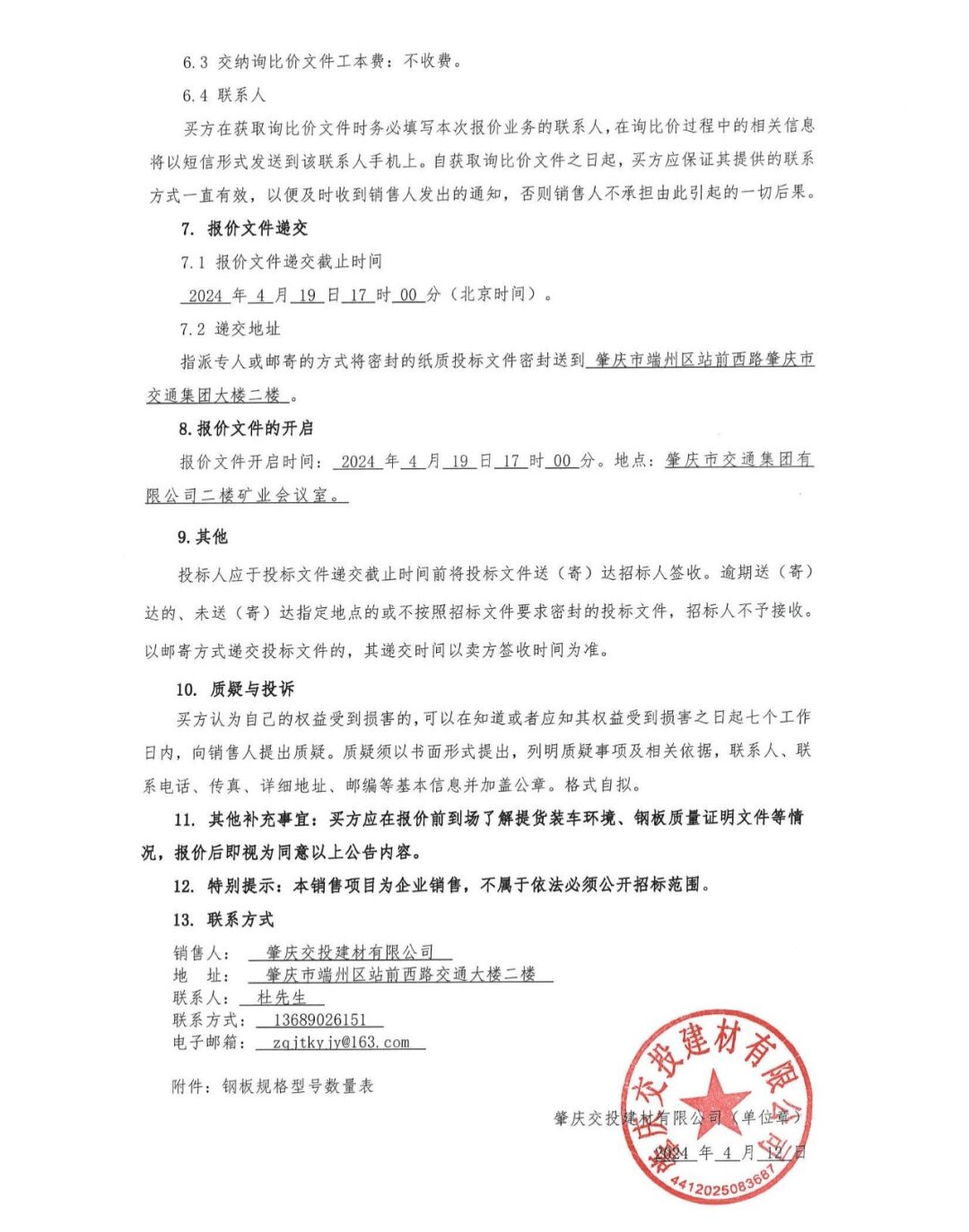 报价文件开启时间:2024 年 4 月 19 日 17 时 00 分。地点:肇庆市交通集团有限公司二楼矿业会议室。