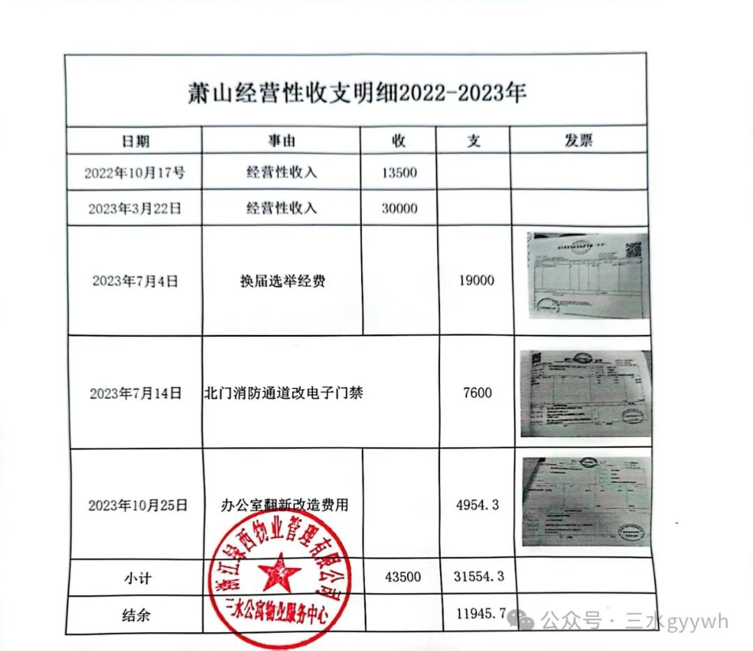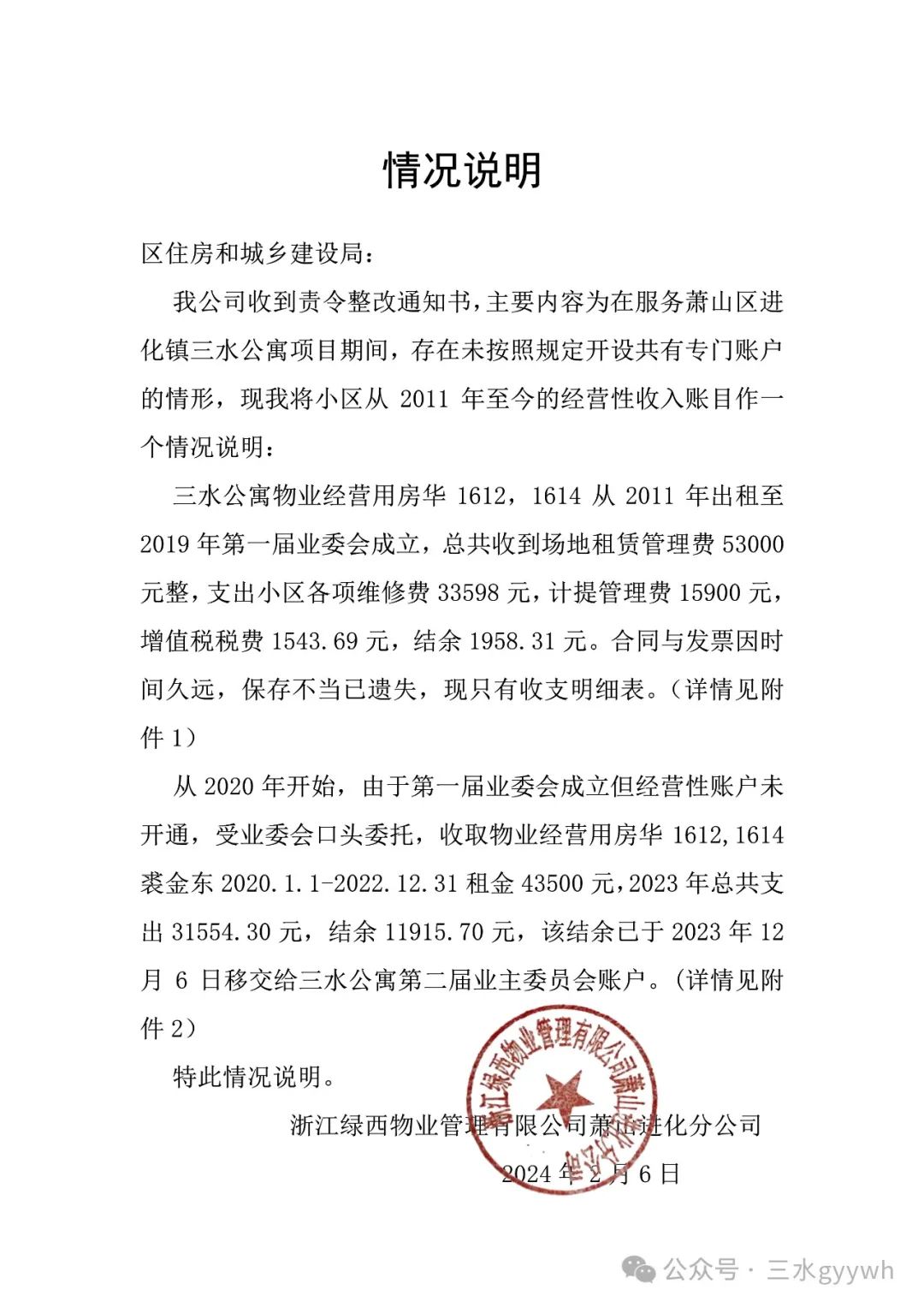 2023年12月6日,物业公司将我小区经营用房、共有部位和设施的经营收入11945.70元,转入业委会账户(明细见图片,盖章是浙江绿西物业公司三水公寓物业服务中心)。2024年1月26日三水公寓矛盾协调会后,区住房和城乡建设局就经营性收入问题约谈物业公司。3月5日,物业服务中心把《情况说明》发给业委会。