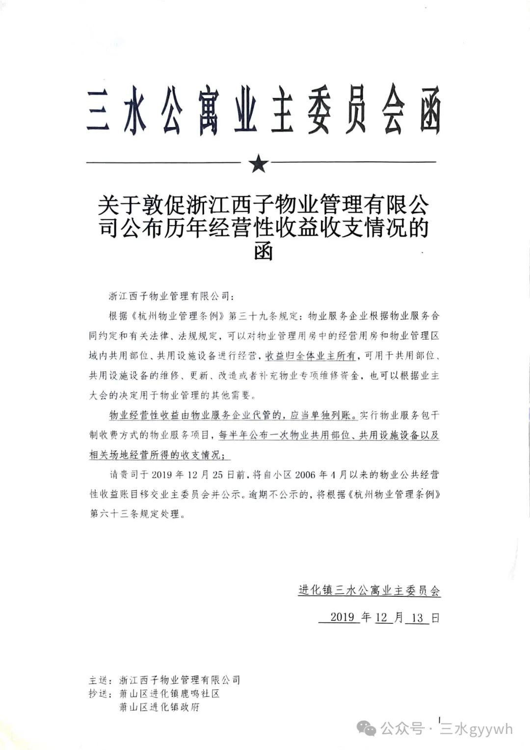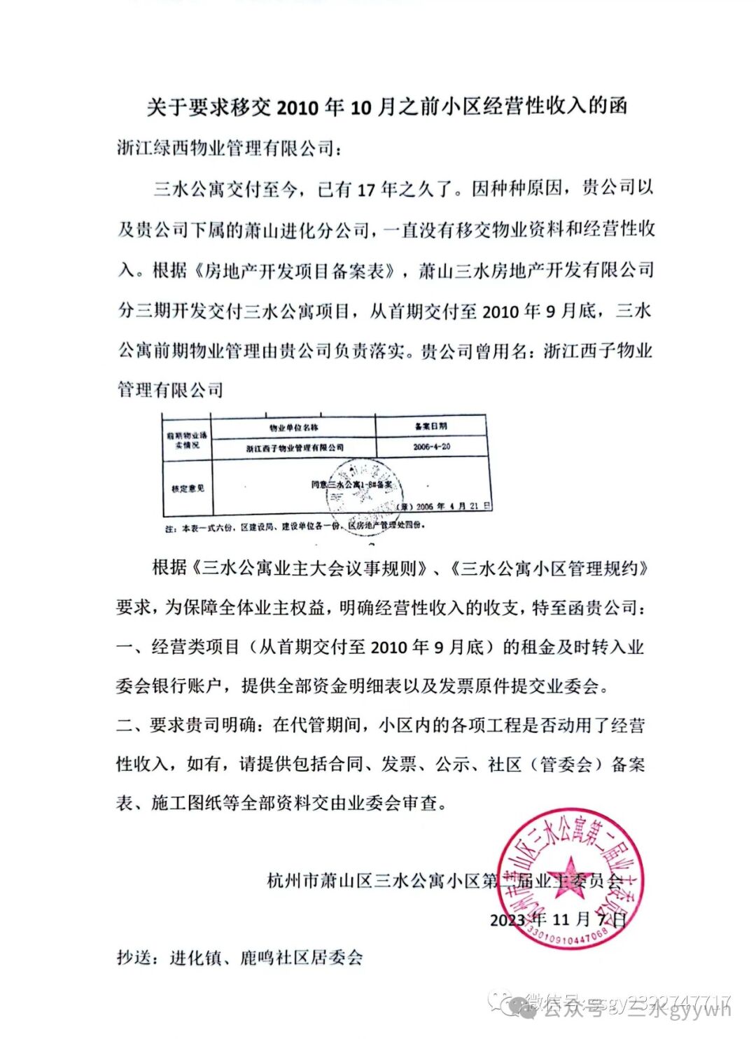 杭州市萧山区三水公寓第二届业主委员会