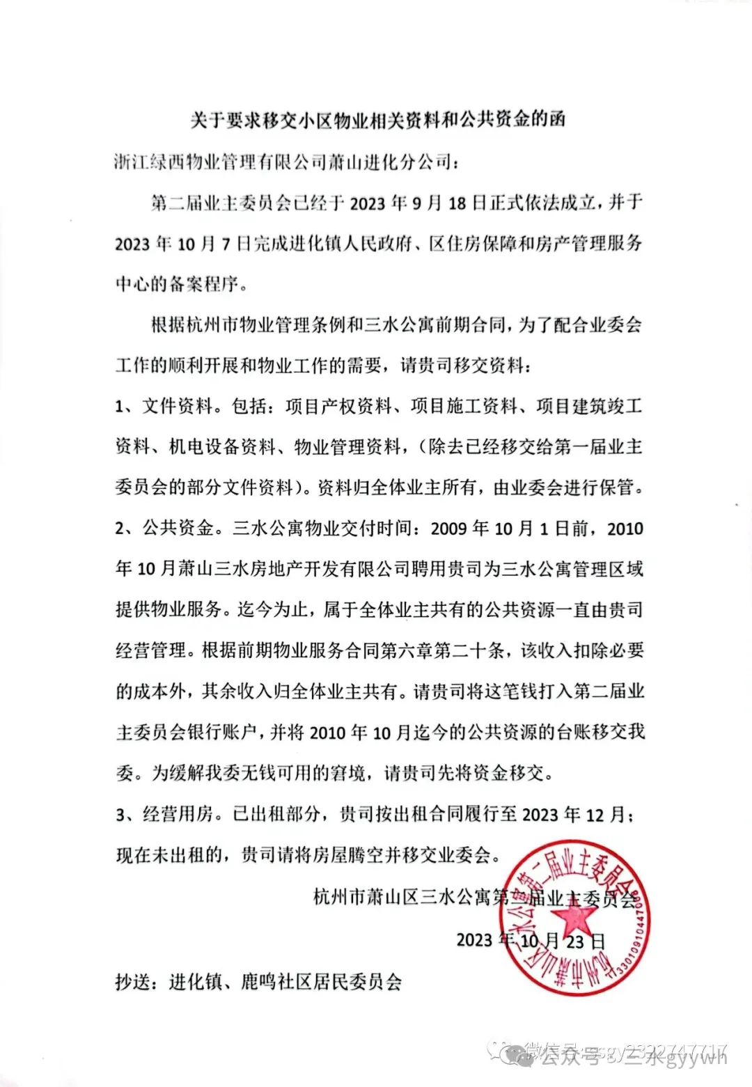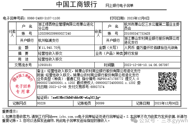 附: 户名:杭州市萧山区三水公寓第二届业主委员会