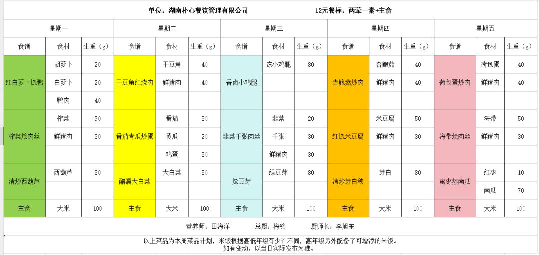 为进一步落实上级文件精神,加强学校配餐管理,确保学生营养均衡,提高学生就餐质量,现将湖南朴心餐饮管理有限公司一周菜谱进行公示,欢迎广大师生、家长提出宝贵意见。