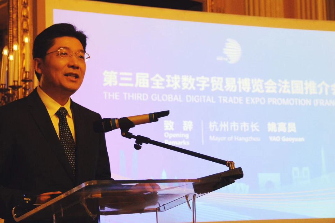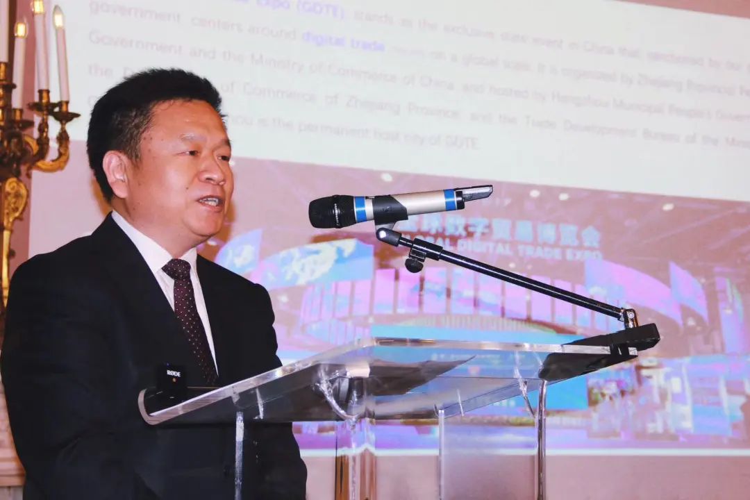姚高员市长在致辞中介绍了杭州经济社会发展概况和数字贸易基本情况。他表示,杭州是底蕴深厚的魅力之城、走向世界的开放之城、活力涌动的数字之城,2023年,杭州全市数字经济核心产业增加值805亿美元、占GDP比重达28.3%,孕育了阿里巴巴等一批世界知名互联网科技企业,数字贸易发展引领中国、影响世界。杭州是中国数字贸易的领跑者,2023年实现数字贸易额452.8亿美元,集聚了中国三分之二的跨境电商平台,跨境电商进出口规模198.7亿美元,跨境电商平台服务覆盖全球220个国家和地区;杭州是中国数字贸易的先行者,早在2015年,获批成为中国首个跨境电商综合试验区,拥有中国唯一以数字为标识的自贸试验区,开展了中国首个数字贸易地方立法;杭州是中国数字贸易的示范者,中国数字贸易领域唯一国家级、国际性、专业型展览——全球数字贸易博览会永久落户杭州。他诚邀大家九月相约杭州,共赴一场技术与创新的盛宴,全面深化数字贸易、智慧城市、国际金融、高端会展等领域交流合作。