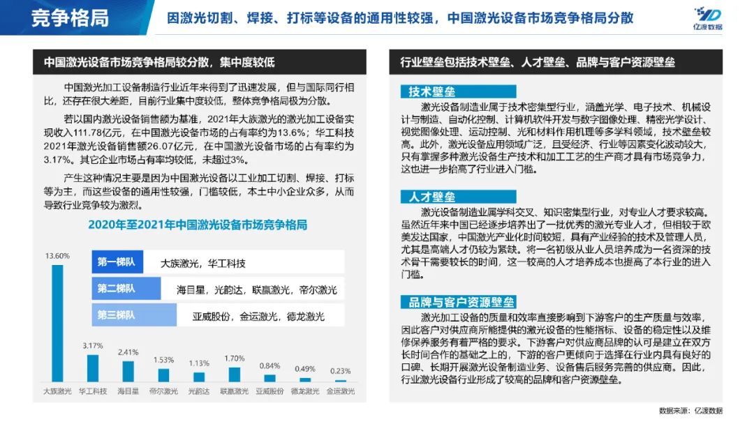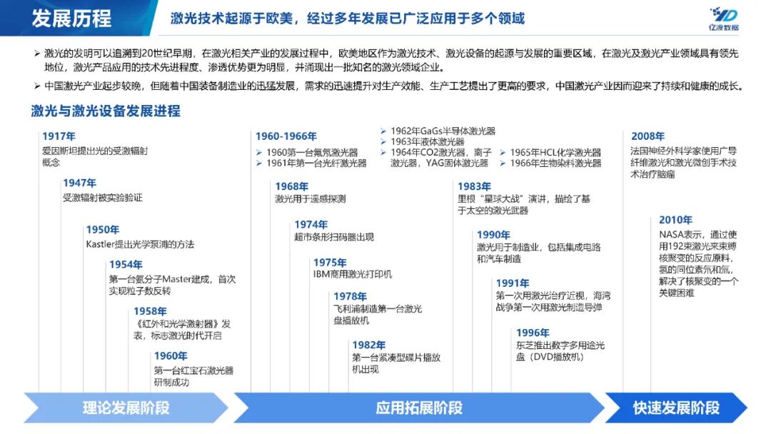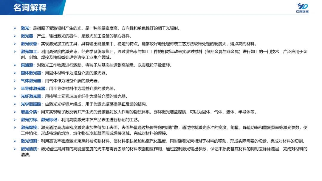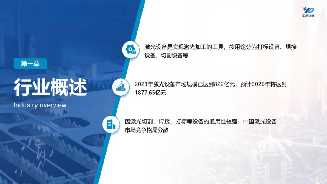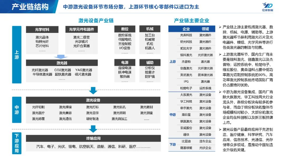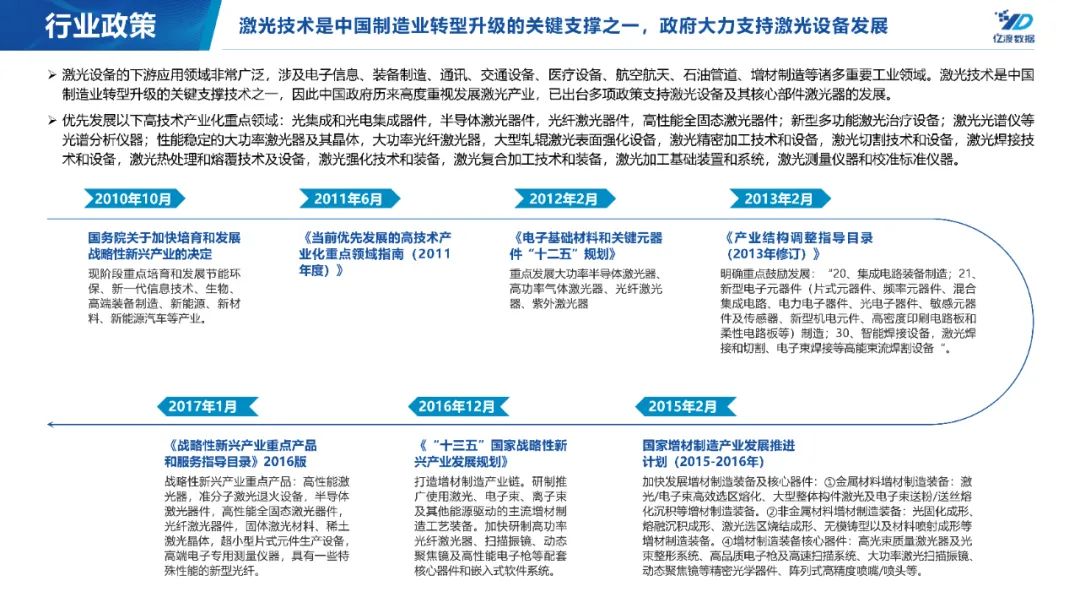 激光是指原子受激辐射产生的光,是一种能量密度高、方向性和单色性好的相干光辐射。激光的良好性能使其在工业、通信、医学、军事等领域具备较高的应用高价值。激光设备是实现激光加工的工具,具有输出能量集中、稳定的特点,能够较好地处理传统工艺方法较难处理的硬度大、熔点高的材料。常见的激光设备主要包括激光切割设备、激光打标设备、激光焊接设备、激光雕刻设备、激光快速成型设备,其它激光设备包括激光美容、激光医疗、激光显示、激光照明、激光测量、激光熔覆、激光通信、激光微加工等。