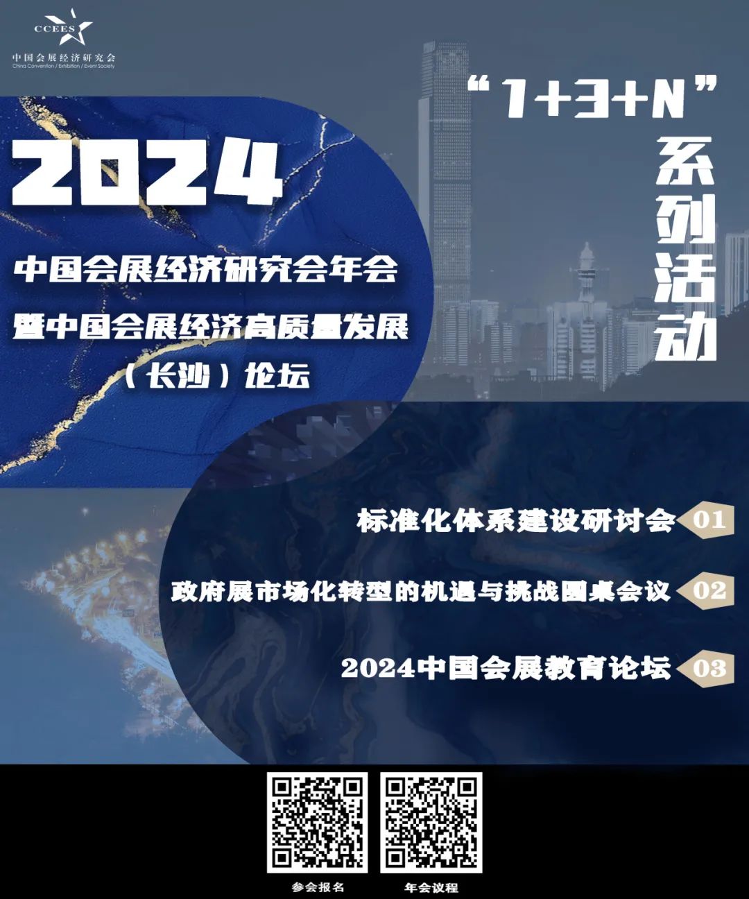 本届年会将围绕“新质生产力,会展高质量”主题,按照“1+3+N”,打造2024年度会展行业盛会。“1”为2024中国会展经济研究会年会暨中国会展经济高质量发展(长沙)论坛。“3”为标准化体系建设研讨会、政府展市场化转型的机遇与挑战圆桌会议和2024中国会展教育论坛。“N”为会展沙龙、会展产供链生态展览展示、《2023年度中国展览数据统计报告》《2024中国会展经济学术论文集》和中国会展经济研究成果等发布活动。